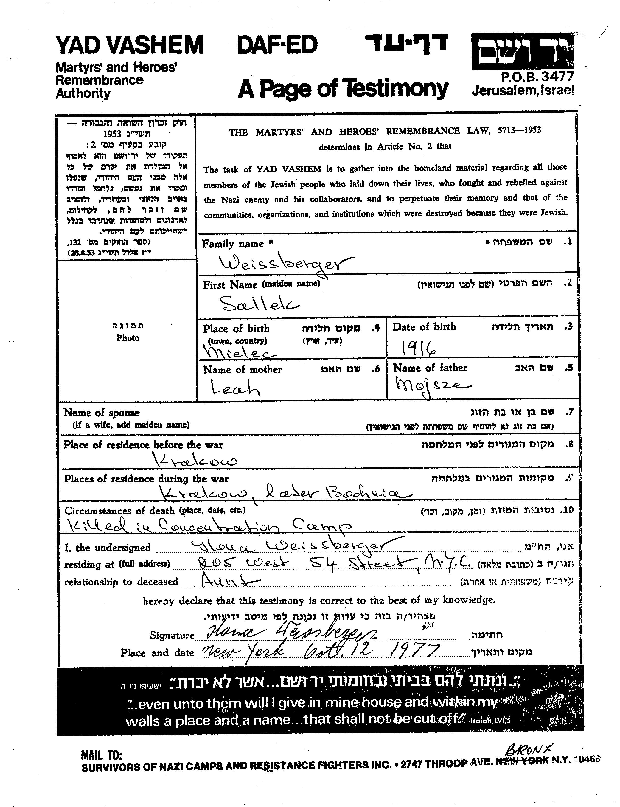 Sallek Weissberger est né à Mielec, Pologne en 1916, fils de Mojsze et de Leah. Avant la seconde guerre mondiale il vivait à Krakow, Pologne. Au cours de la guerre, il était à Krakow, Pologne.