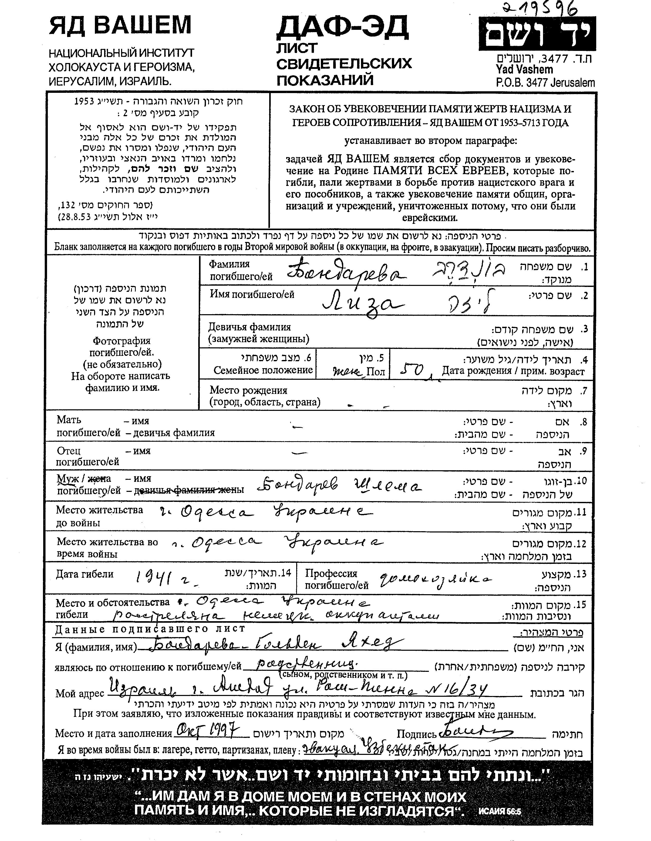 Bondareva Liza 1891 Odessa, Ukraine (URSS) Feuille de témoignage