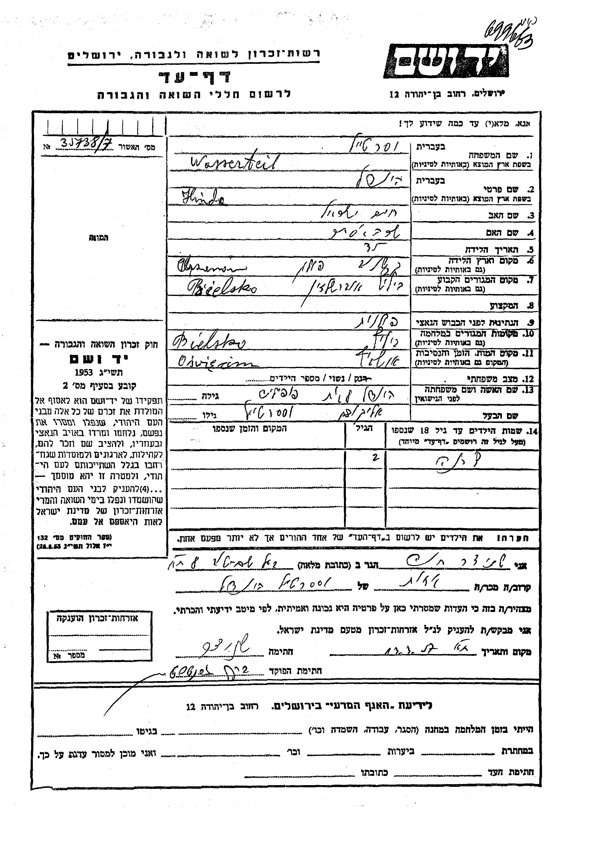 Hinde Wasserteil née Pufeles est née à Chrzanow, Pologne, fille de Khaim Yisrael et de Sara Ester. Elle était Mariée à Eliyakum. Avant la seconde guerre mondiale elle vivait à Bielsko, Pologne. Pendant la guerre, elle était à Bielsko, Pologne.