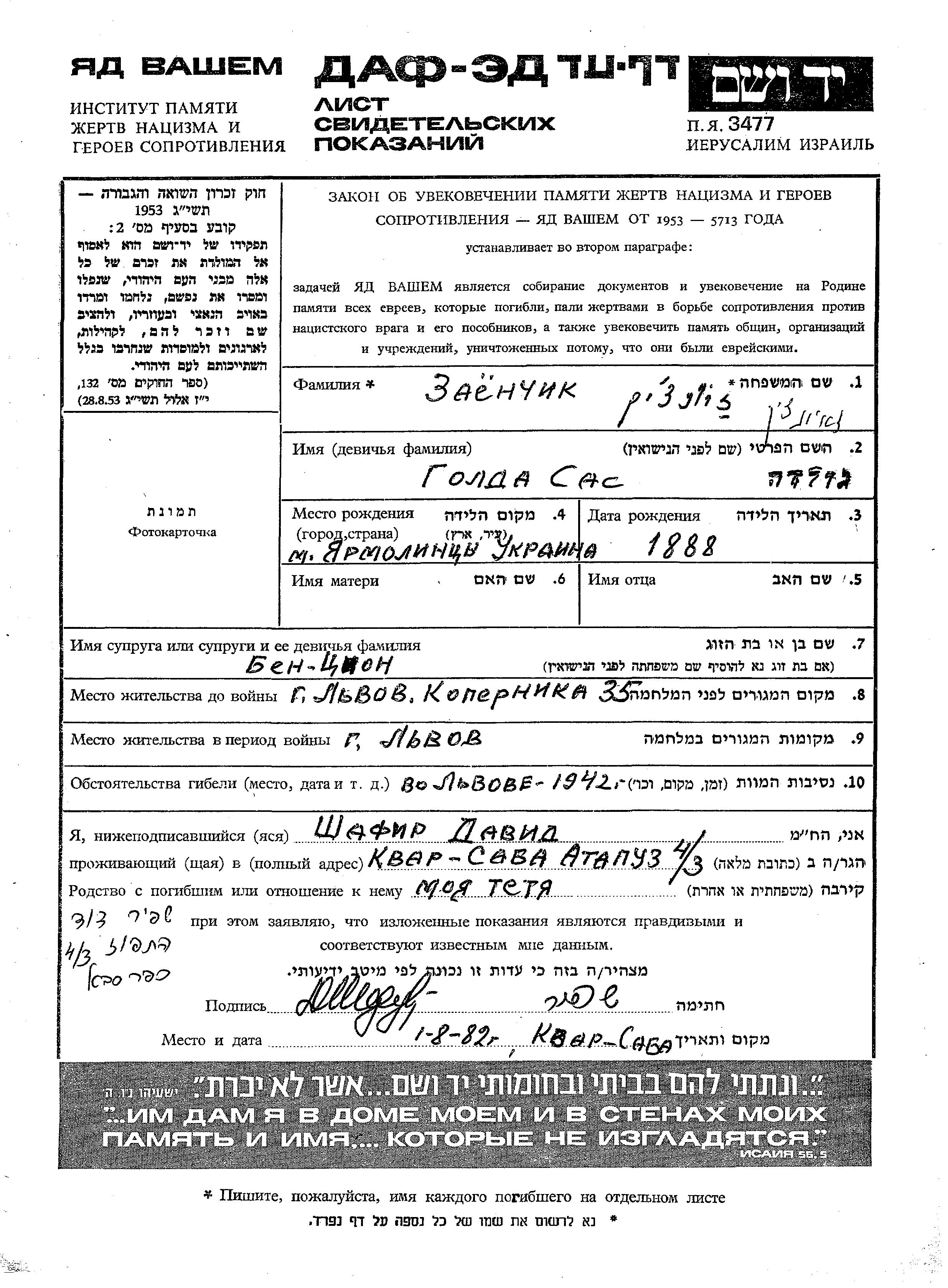 Golda Zayonchik née Sas est née à Jarmolince, Ukraine (URSS) en 1888. Elle était Mariée à Ben Tzion. Avant la seconde guerre mondiale elle vivait à Lwow, Pologne. Pendant la guerre, elle était à Lwow, Pologne.
