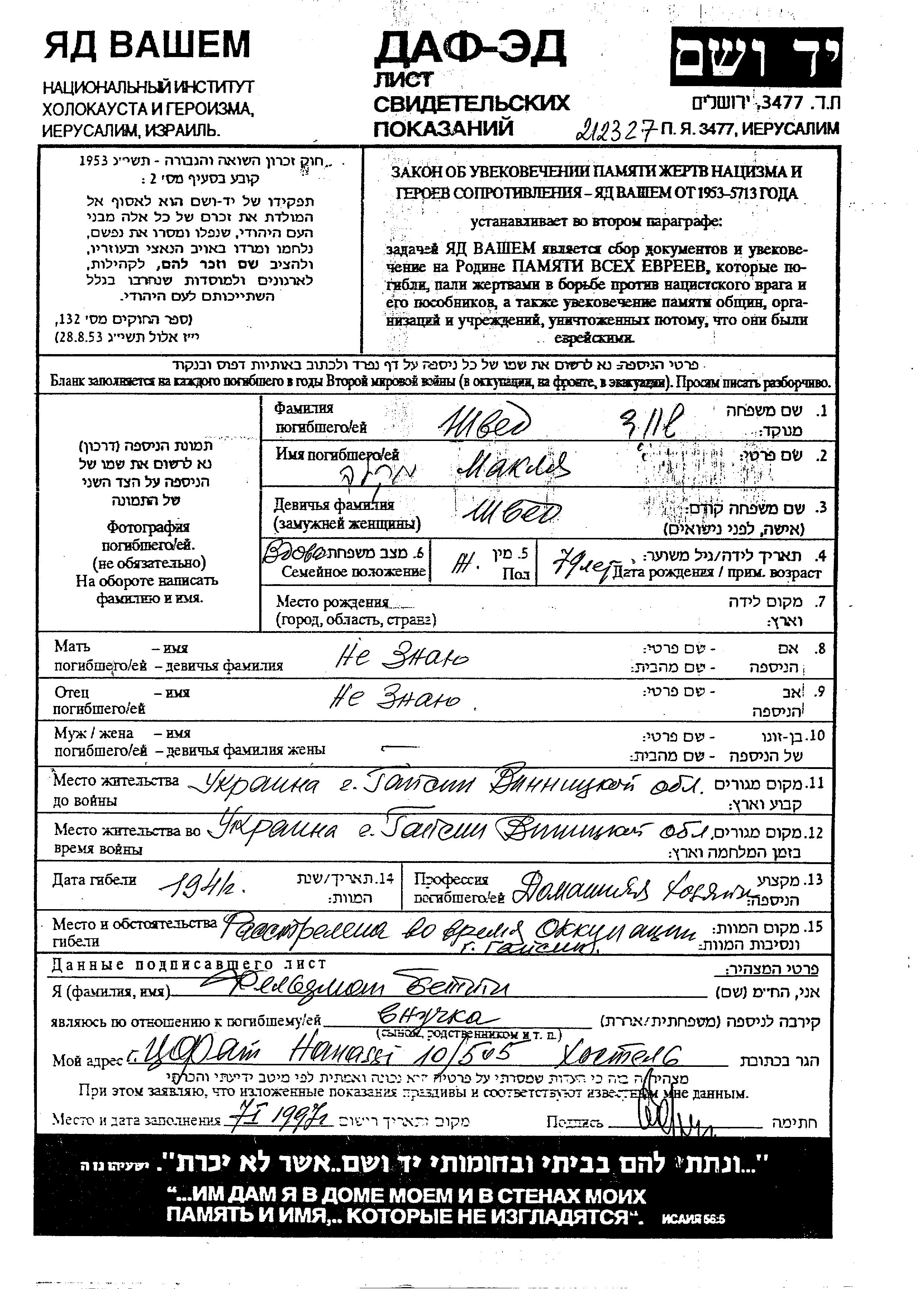 Maklya a été assassinée pendant la Shoah. Lieu de la mort: Gaysin, Ukraine (URSS) en 1941.