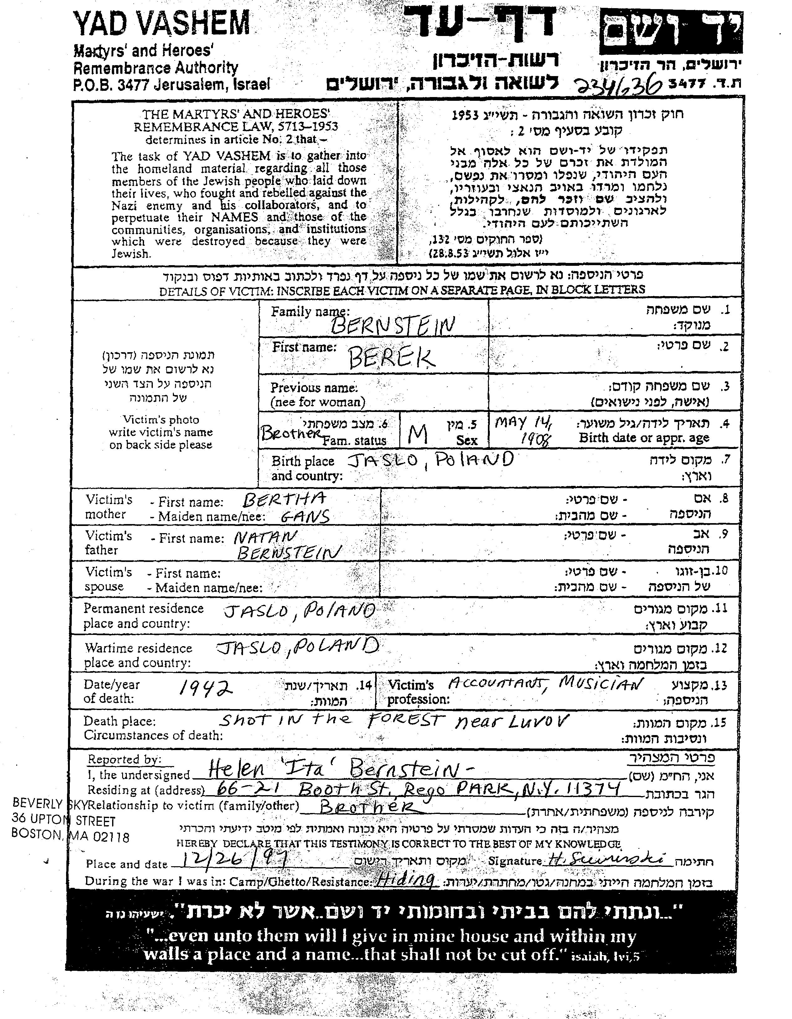 Bernstein Branshtein Berek 1908 Jaslo, Pologne Feuille de témoignage
