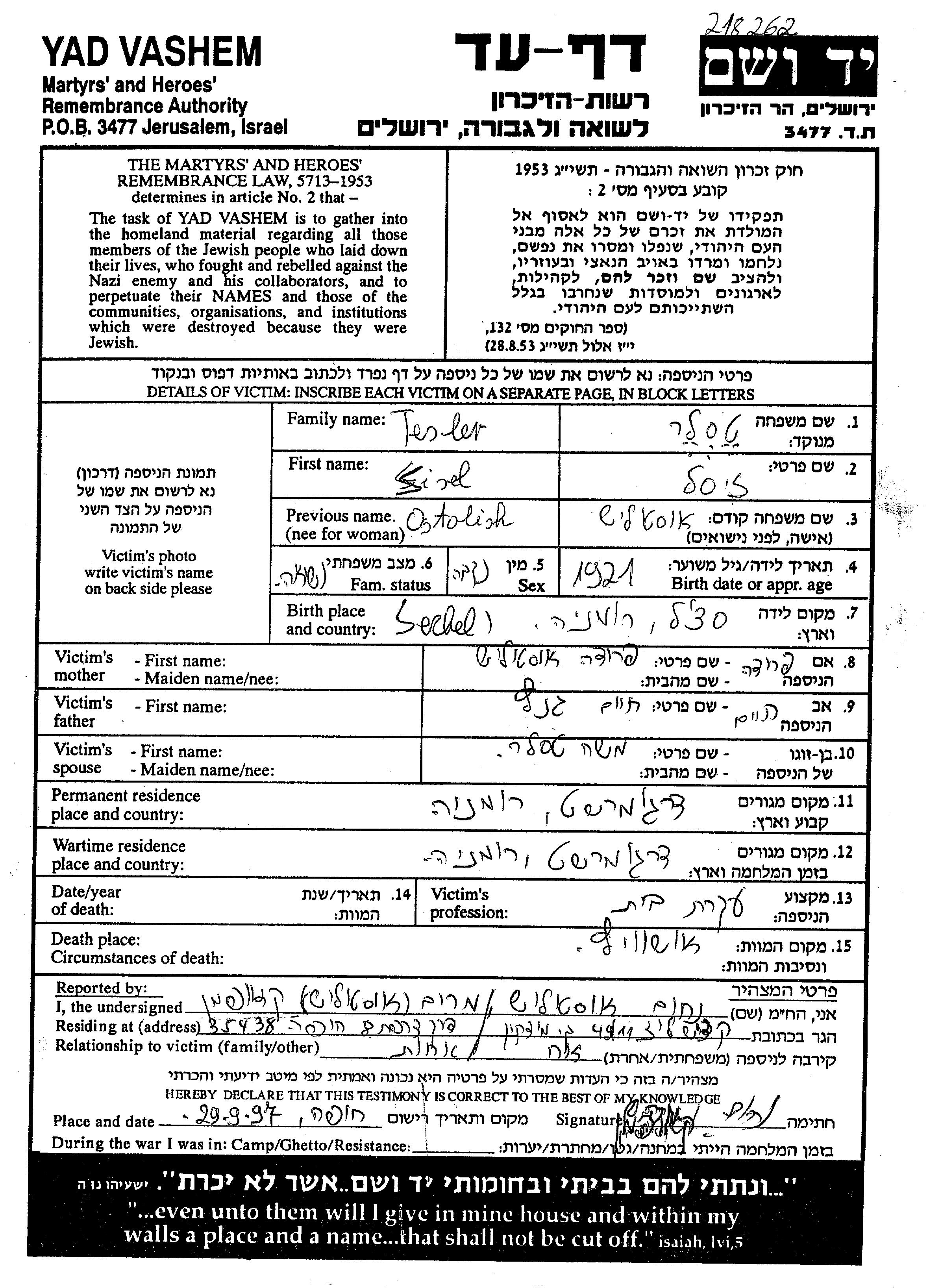 Zisel Tesler née Ostolish est née à Sacel, Roumanie en 1921, fille de Khaim et de Frida née Asztalos. Elle était Femme au foyer et Mariée à Moshe. Avant la seconde guerre mondiale elle vivait à Dragomiresti, Roumanie. Pendant la guerre, elle était à Dragomiresti, Roumanie.