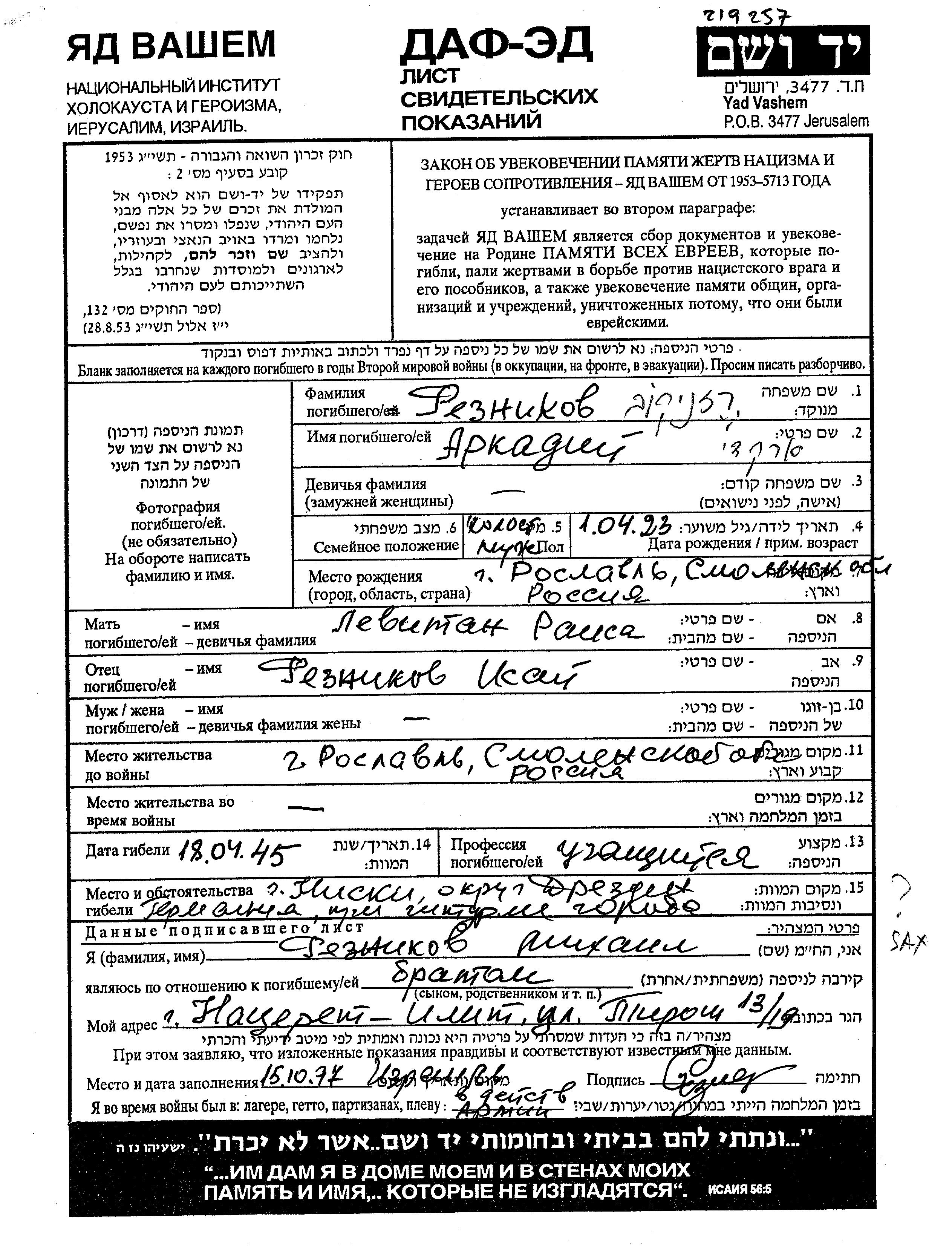 Arkadi Reznikov est né à Roslavl, Russie (URSS) en 1923, fils de Isai et de Raisa née Levitan. Il était Élève et Célibataire. Avant la seconde guerre mondiale il vivait à Roslavl, Russie (URSS). Au cours de la guerre, il était à the Soviet armed forces. Arkadi a été tué en tant que militaire pendant la Seconde Guerre mondiale. Lieu de la mort: Niesky, Allemagne en 18/04/1945.
