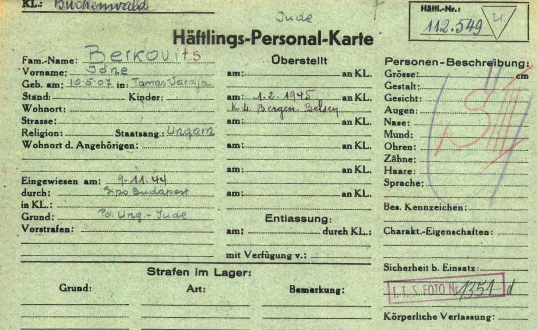 Berkovits Jone 1907 endroit inconnu, Fichier de ITS