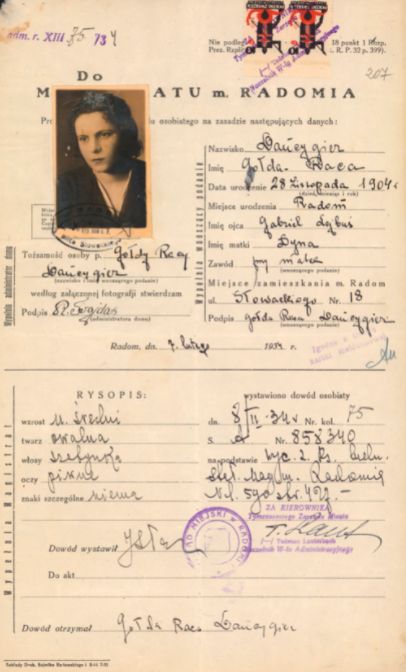 Dancygier Golda Raca 1904 Radom, Pologne Carte d'identité