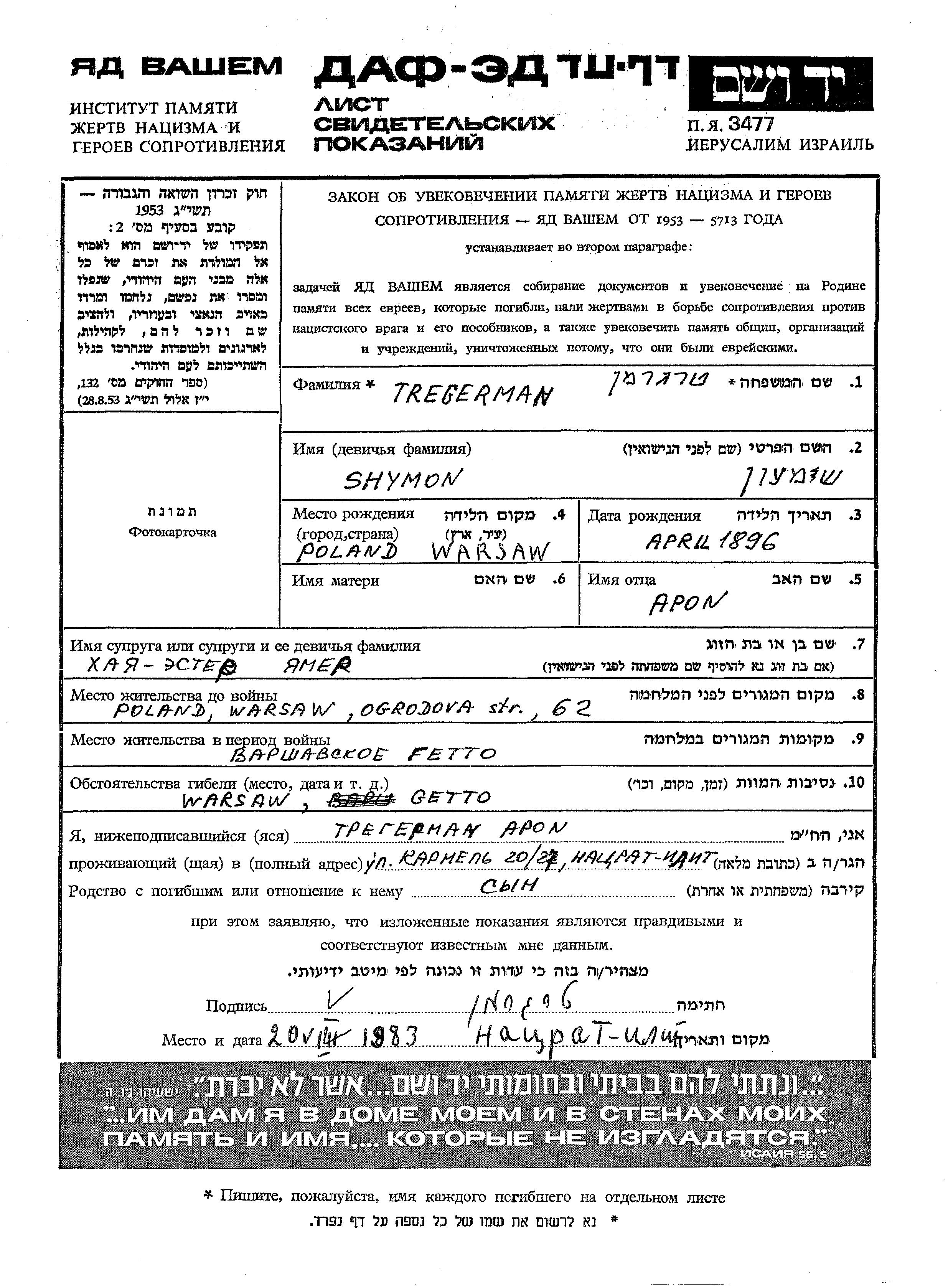 Tregerman Shymon 1896 Warsaw, Pologne Feuille de témoignage