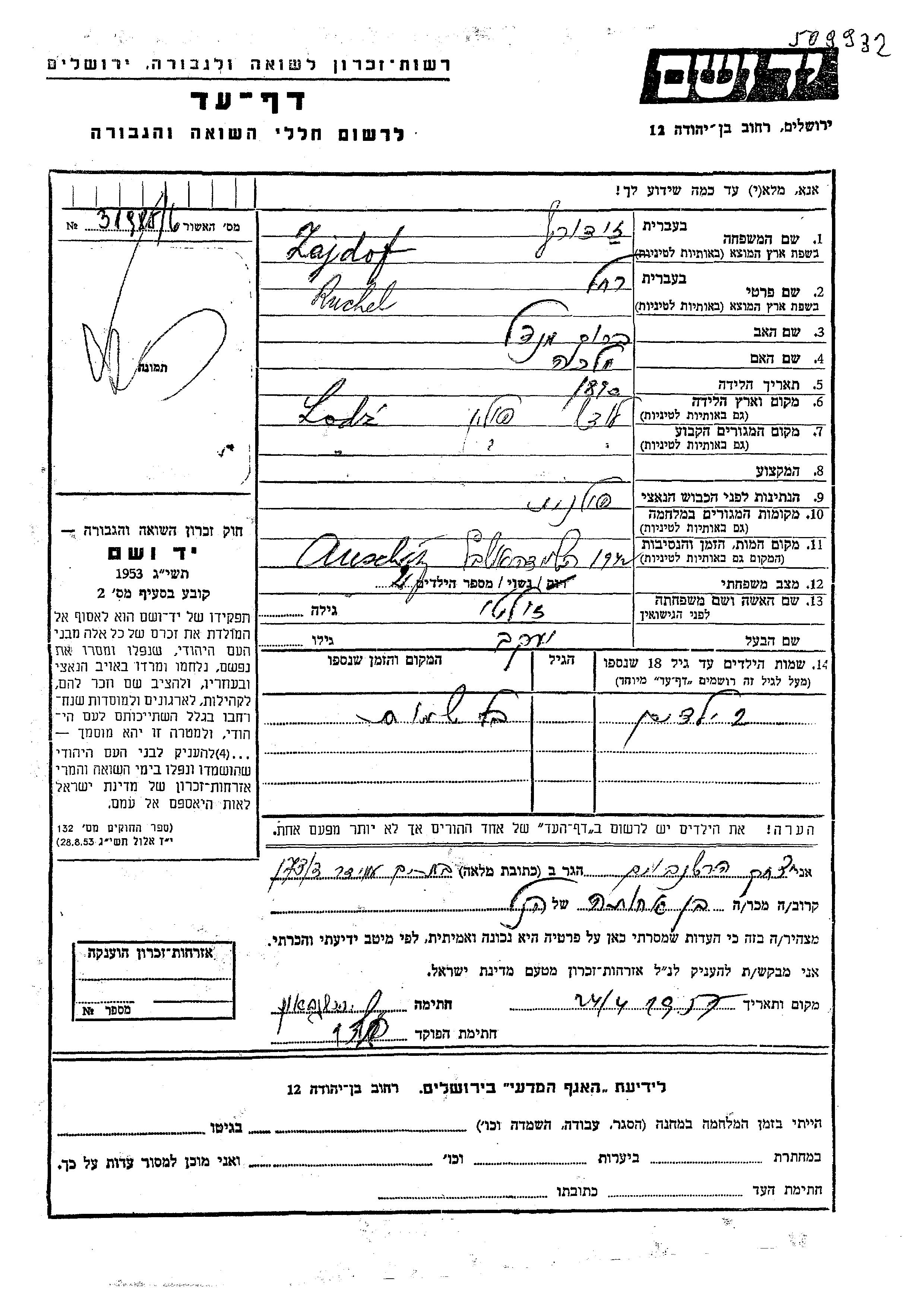 Ruchel Zajdof née Zhulti est née à Lodz, Pologne. Elle était Femme au foyer. Avant la seconde guerre mondiale elle vivait à Lodz, Pologne.