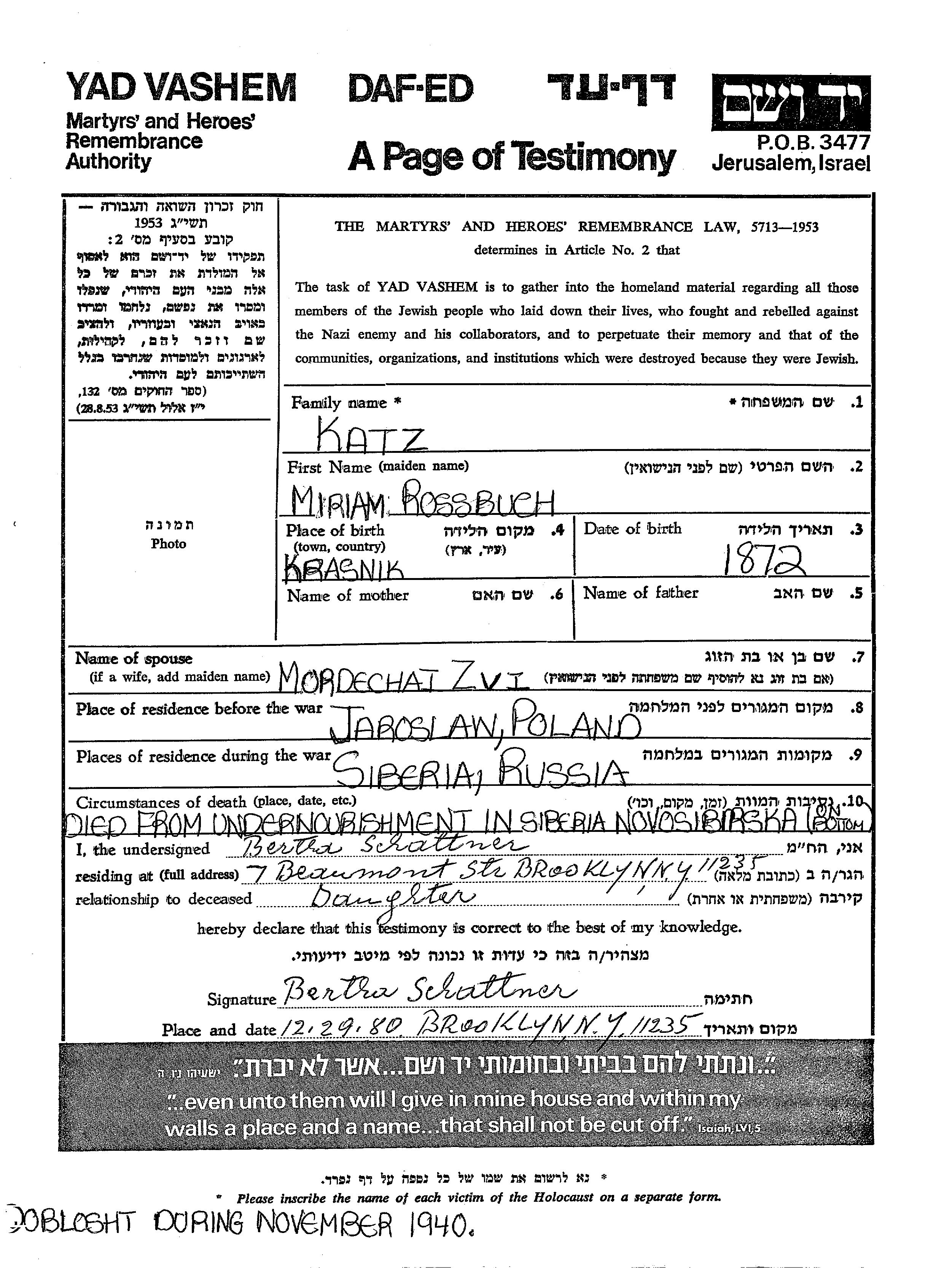 Miriam Katz née Rossbuch est née à Kraśnik, Pologne en 1872. Elle était Mariée à Mordechai Zvi. Avant la seconde guerre mondiale elle vivait à Jaroslaw, Pologne. Pendant la guerre, elle était à Siberia Region, Russie (URSS).