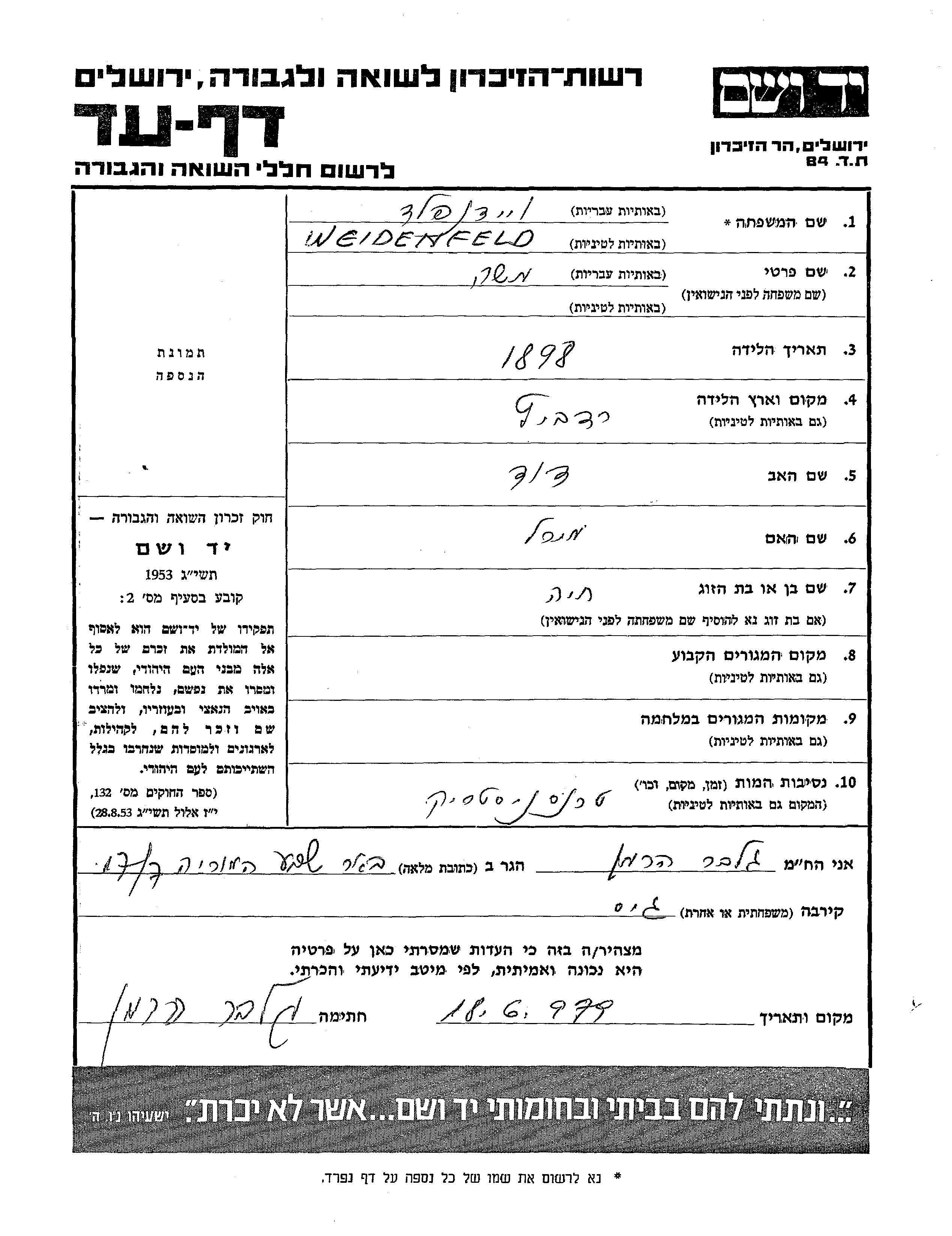 Weidenfeld Moshe 1898 endroit inconnu, Feuille de témoignage