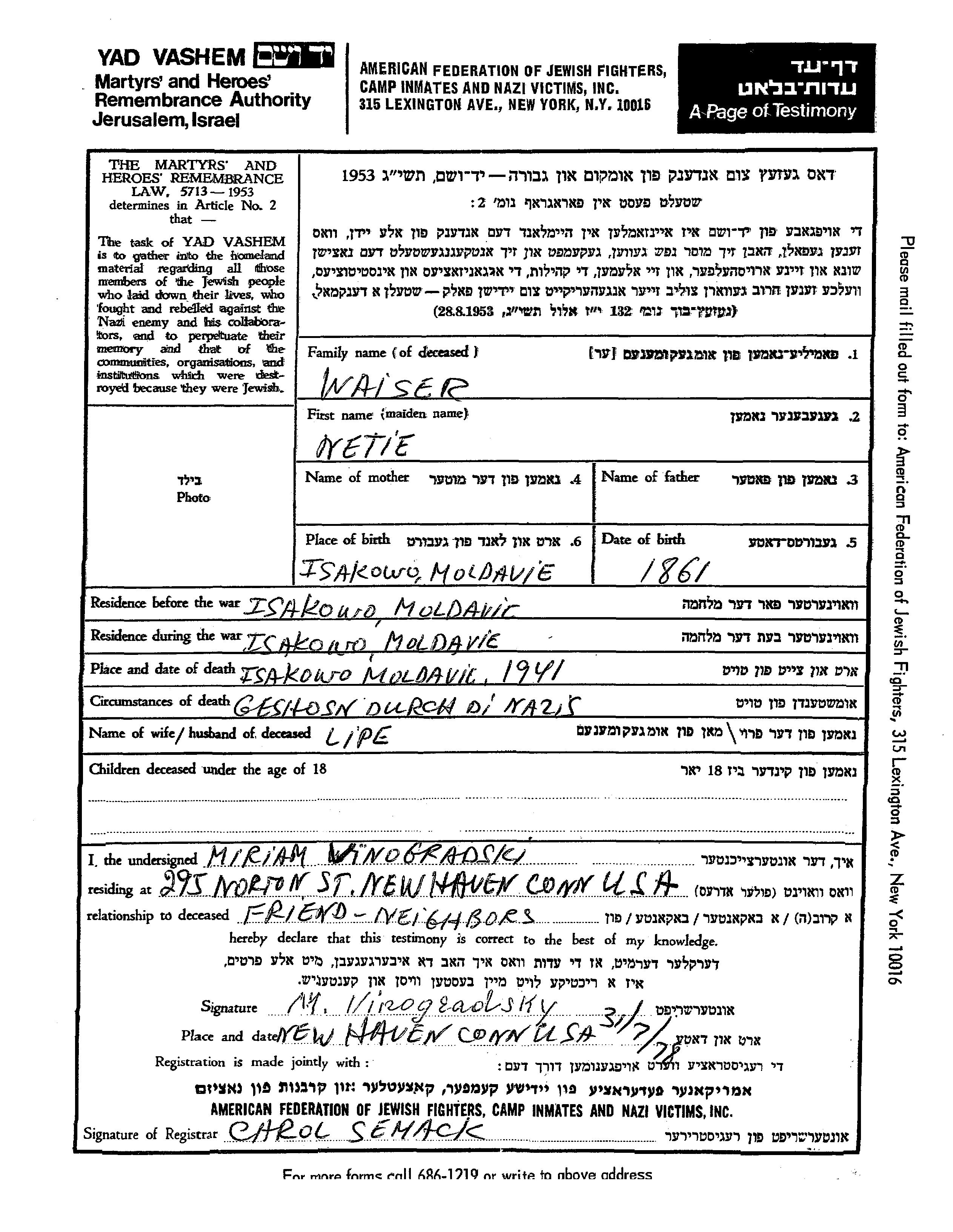 Netie a été assassinée pendant la Shoah. Lieu de la mort: Isakowo, Roumanie en 1941.