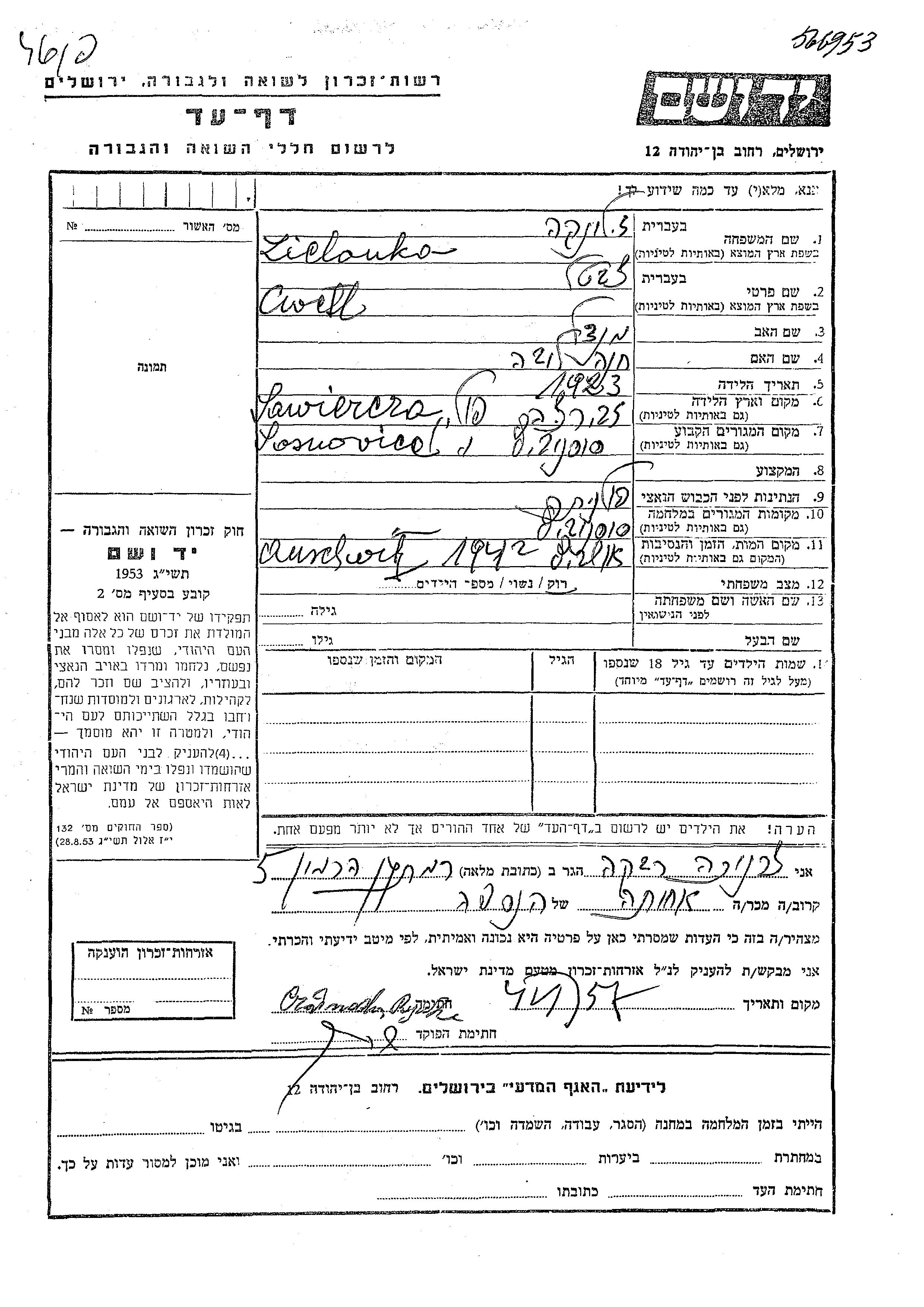 Yad Vashem - Pages of Testimony Names Memorial Collection
