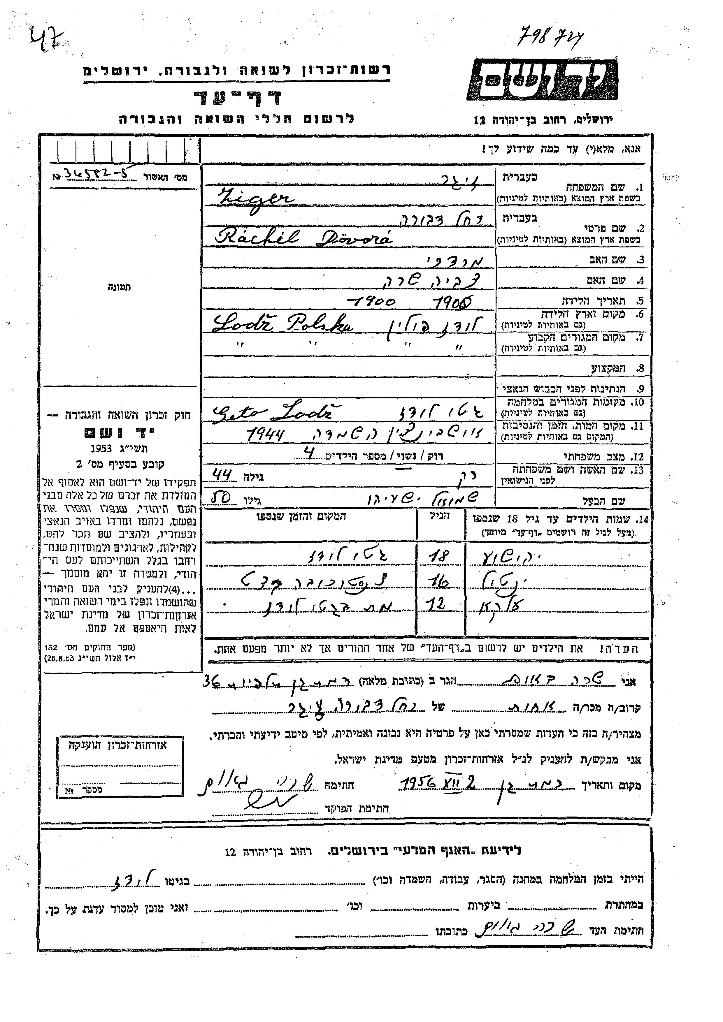 Ziger Rachel Dovora 1900 Lodz, Pologne Feuille de témoignage