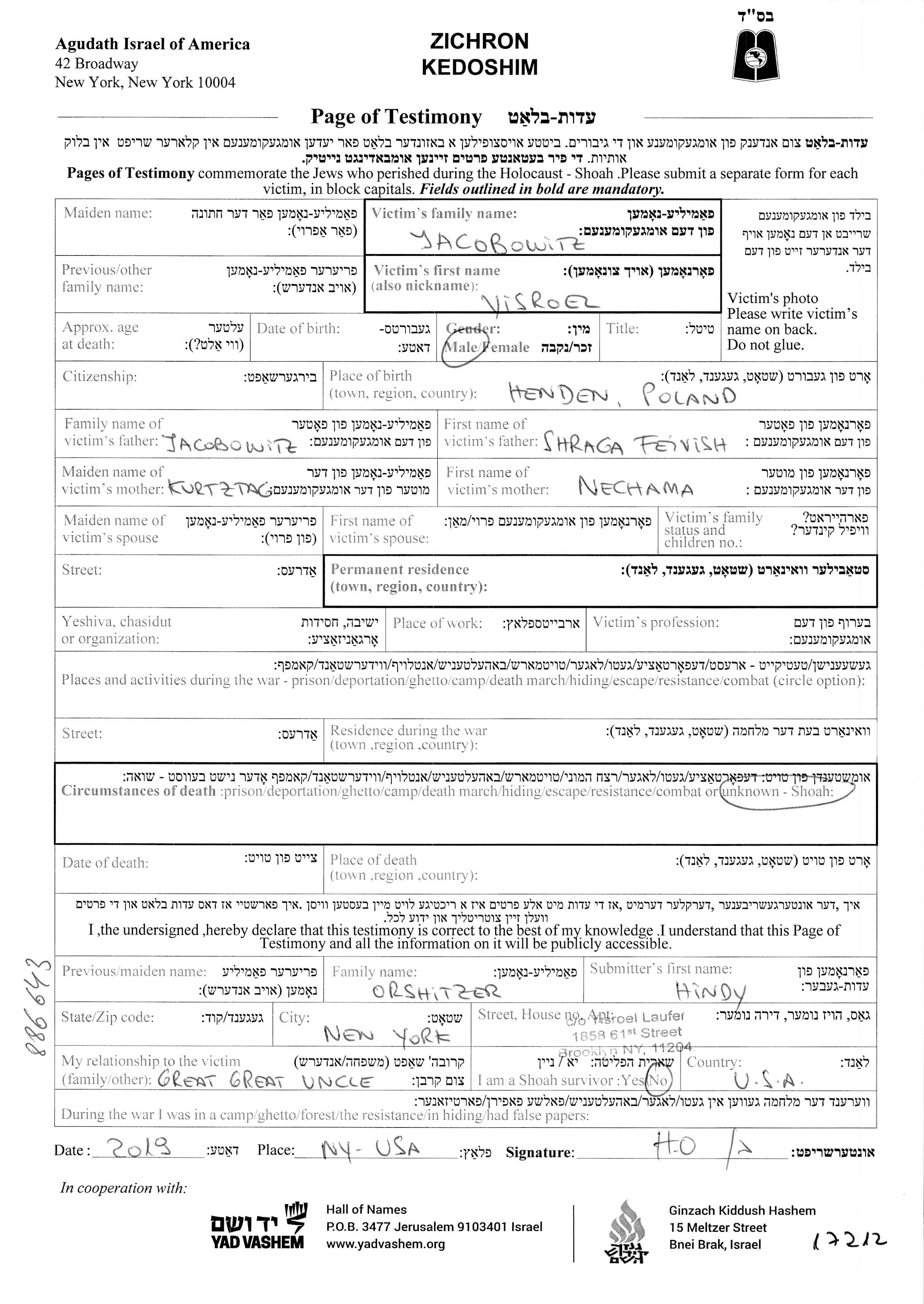 Jacobowitz Yisroel endroit inconnu, Feuille de témoignage