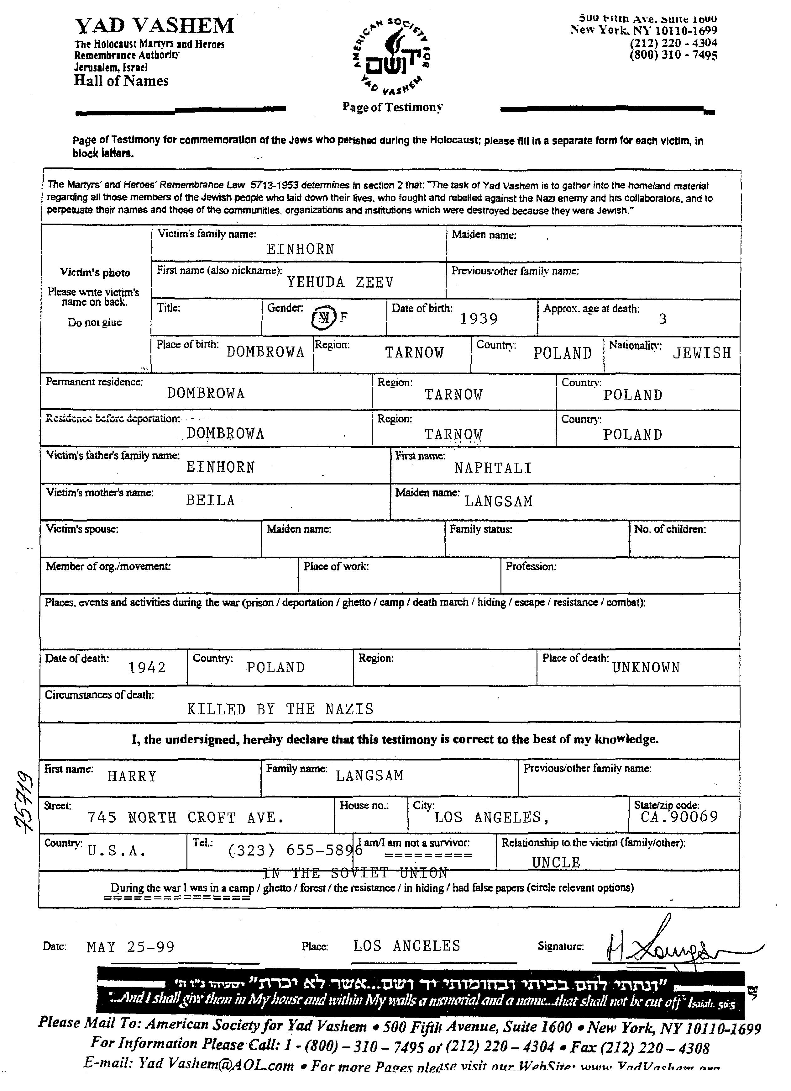 Einhorn | Yehuda Zeev | 1939 | Dabrowa Tarnowska, Pologne | Feuille de témoignage |