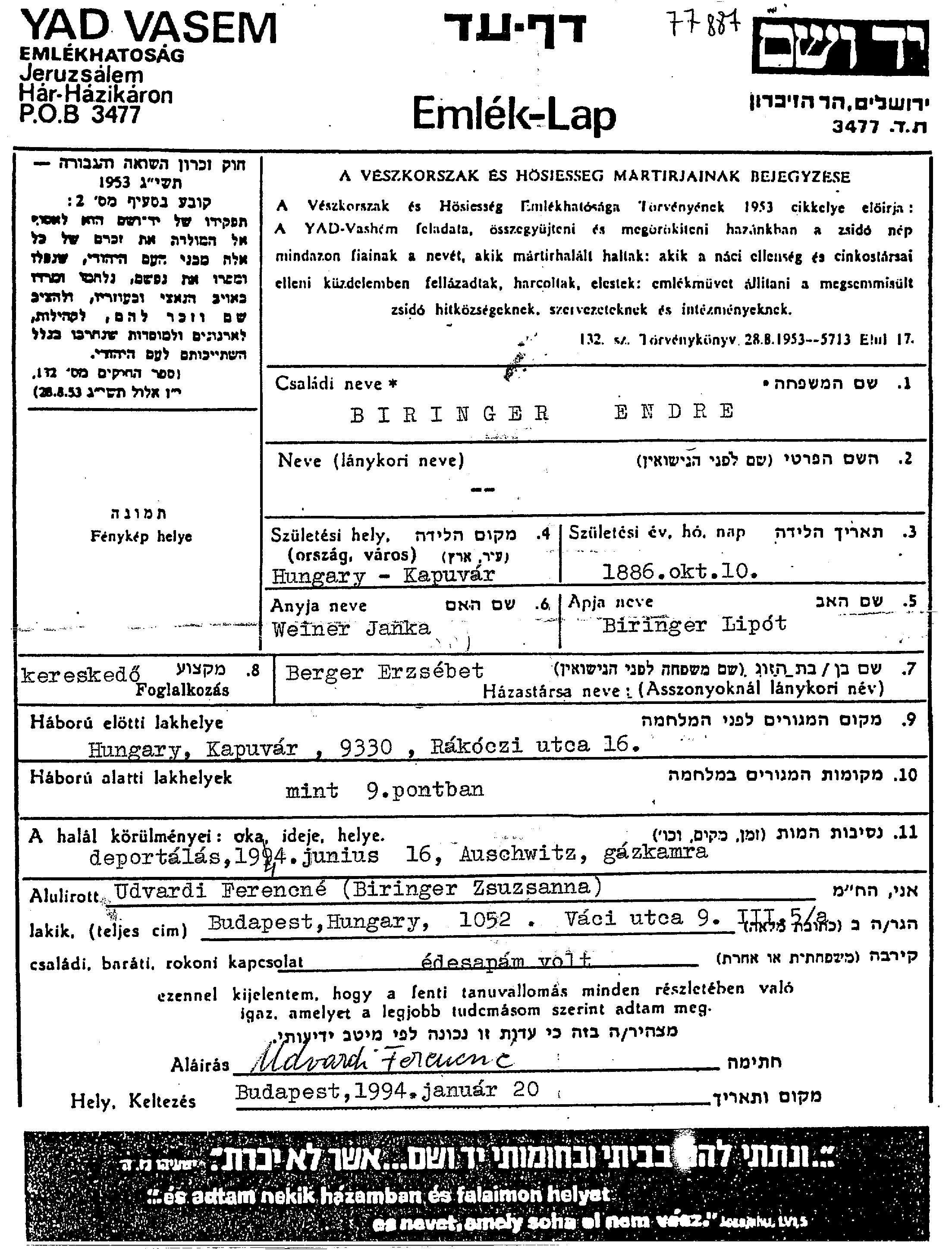 Biringer | Endre | 1886 | Kapuvar, Hongrie | Liste des Juifs de Hongrie assassinés |