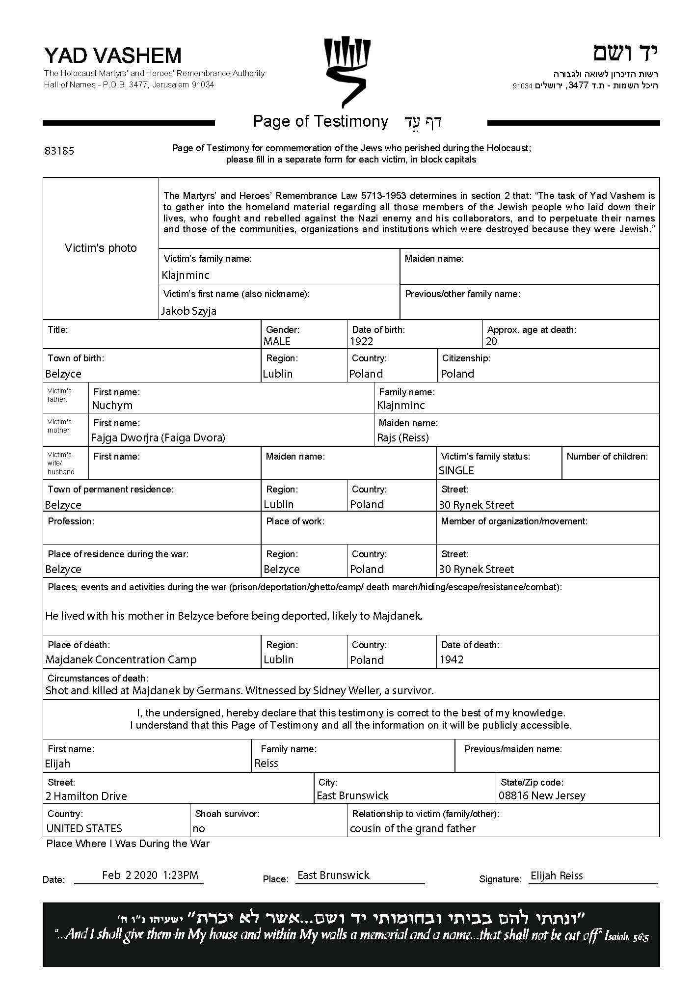 Klajnminc Jakob Szyja 1922 Belzyce, Pologne Feuille de témoignage (digitale)