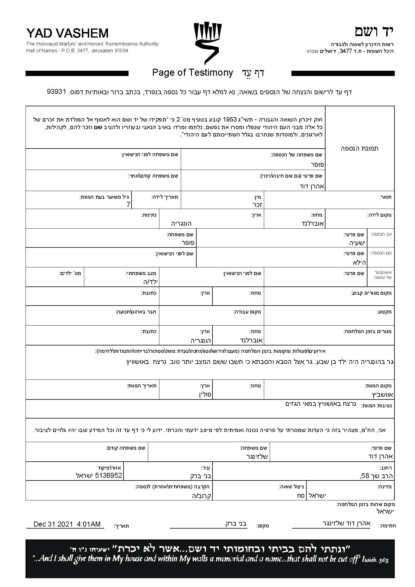 Poper Aharon David Hongrie Feuille de témoignage (digitale)