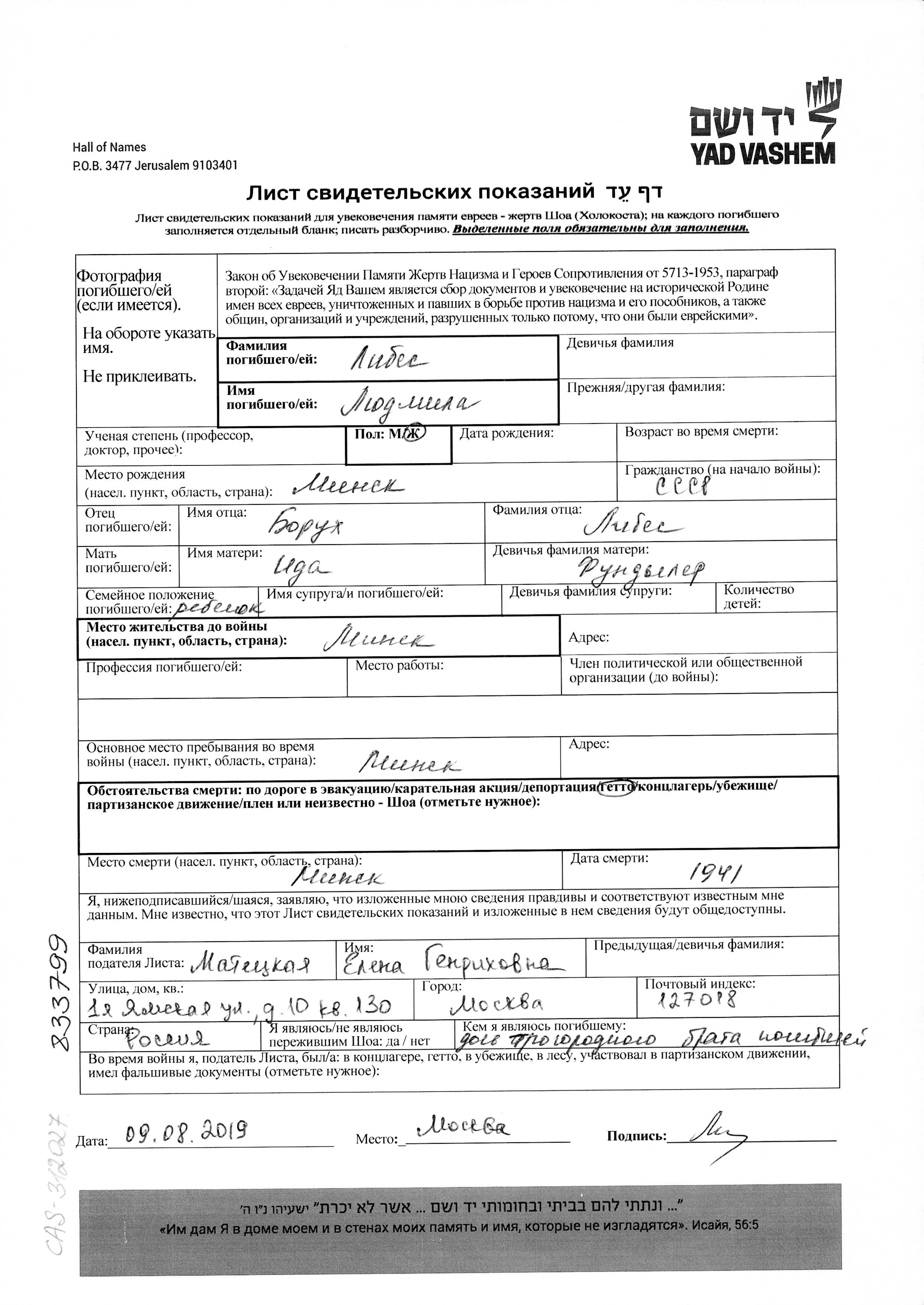 Libes | Lyudmila | Minsk, Bélorussie (URSS) | Feuille de témoignage | |