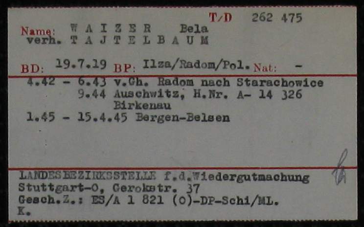 Bajla Rywka Wajzer Teitelbaum est née à Ilza, Pologne en 1919. Elle était Handlungsgehilfe. Avant la seconde guerre mondiale elle vivait à Radom, Pologne.