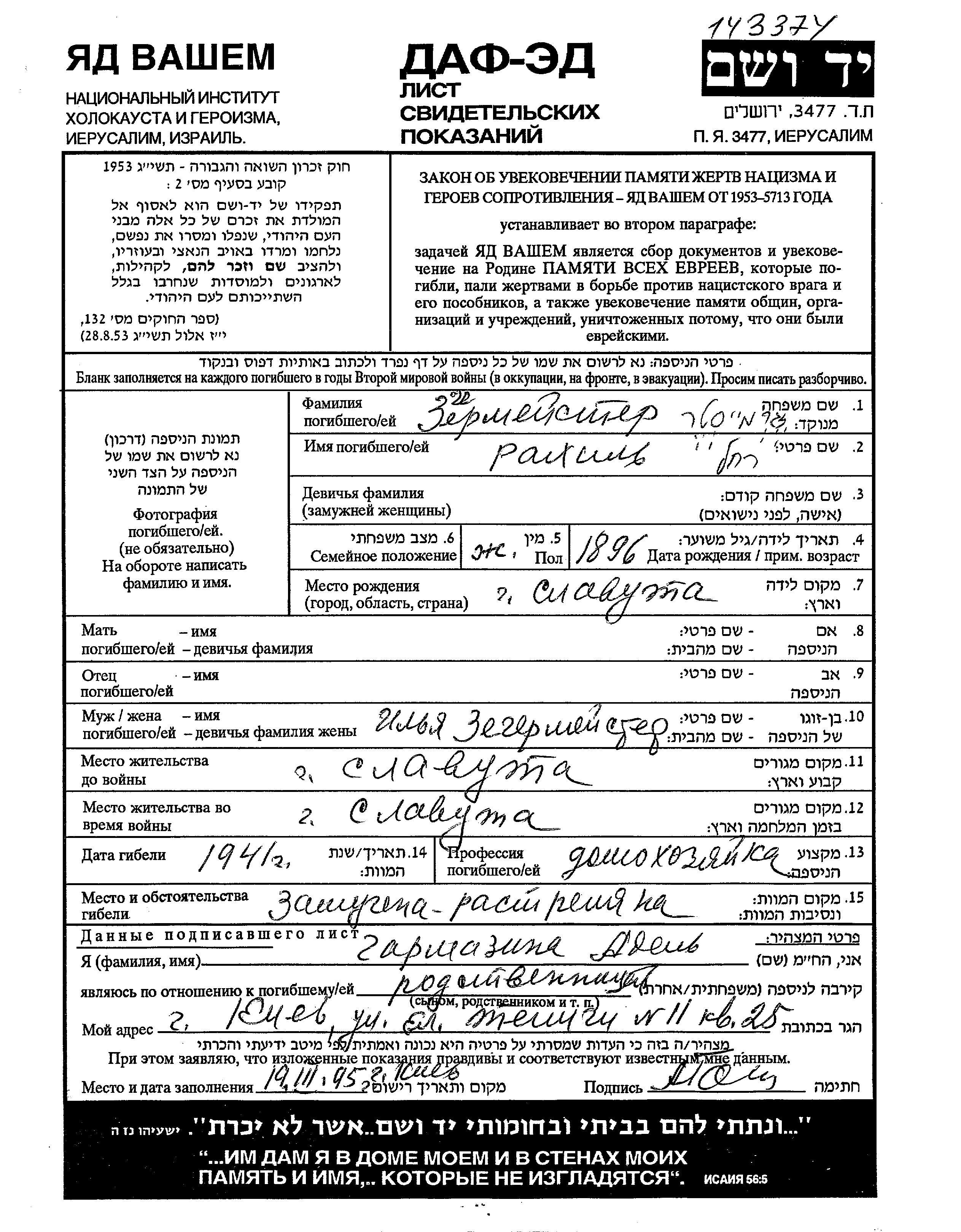 Zegermeister Rakhil 1896 Slavuta, Ukraine (URSS) Feuille de témoignage