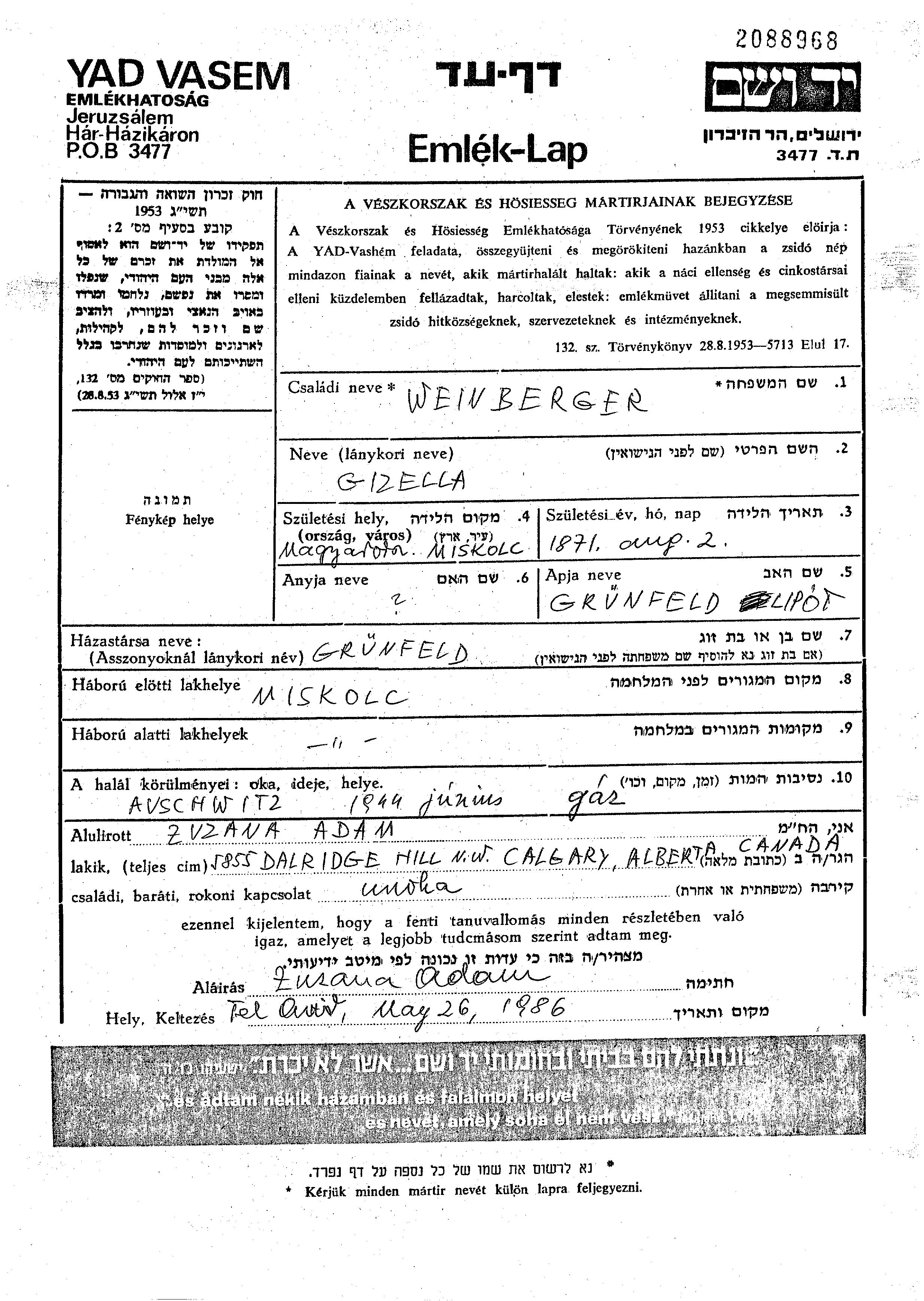 Weinberger | Gizella | 1871 | Miskolc, Hongrie | Feuille de témoignage |