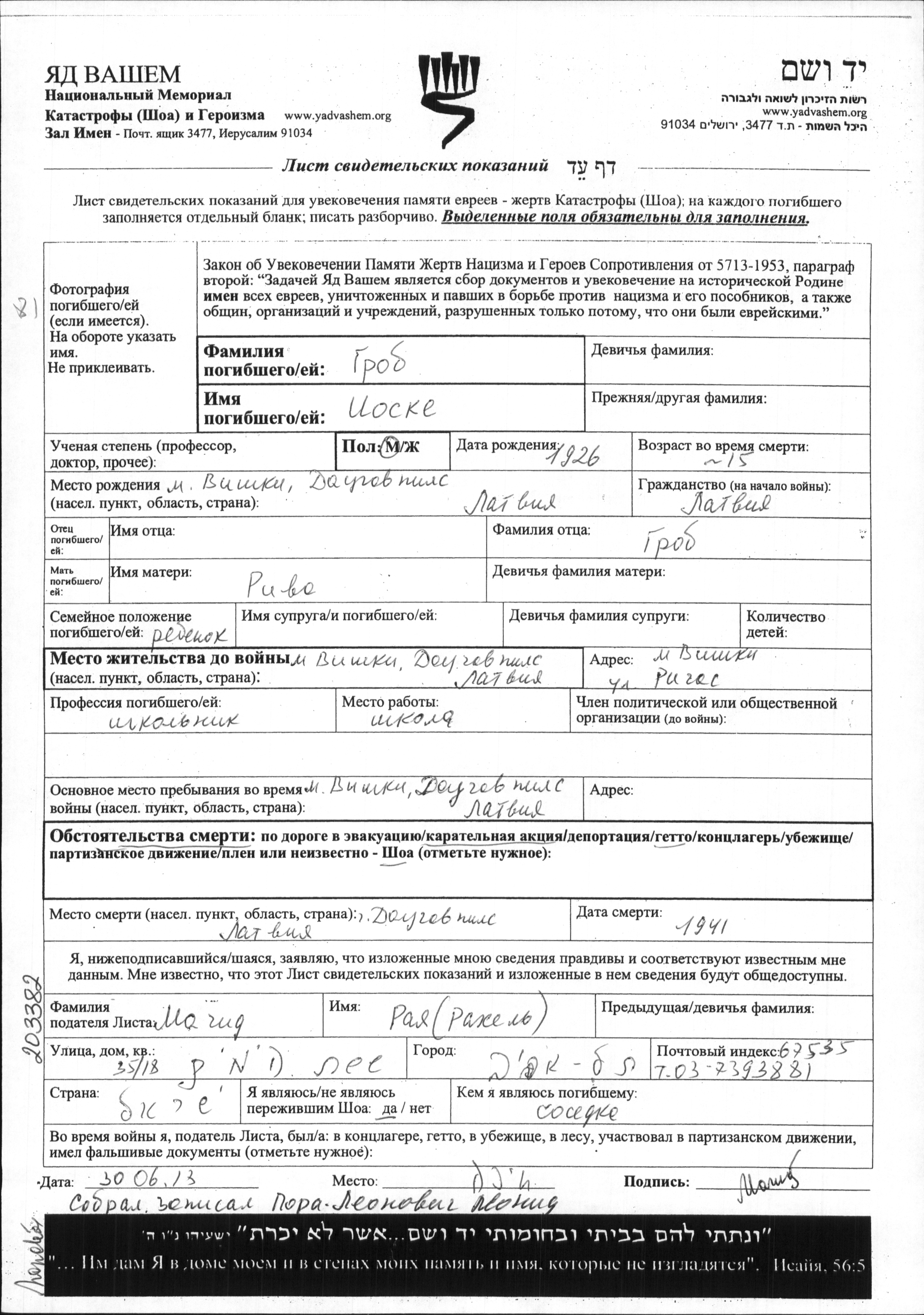 | Grob | Ioske | 1926 | Vishki, Lettonie | Feuille de témoignage |