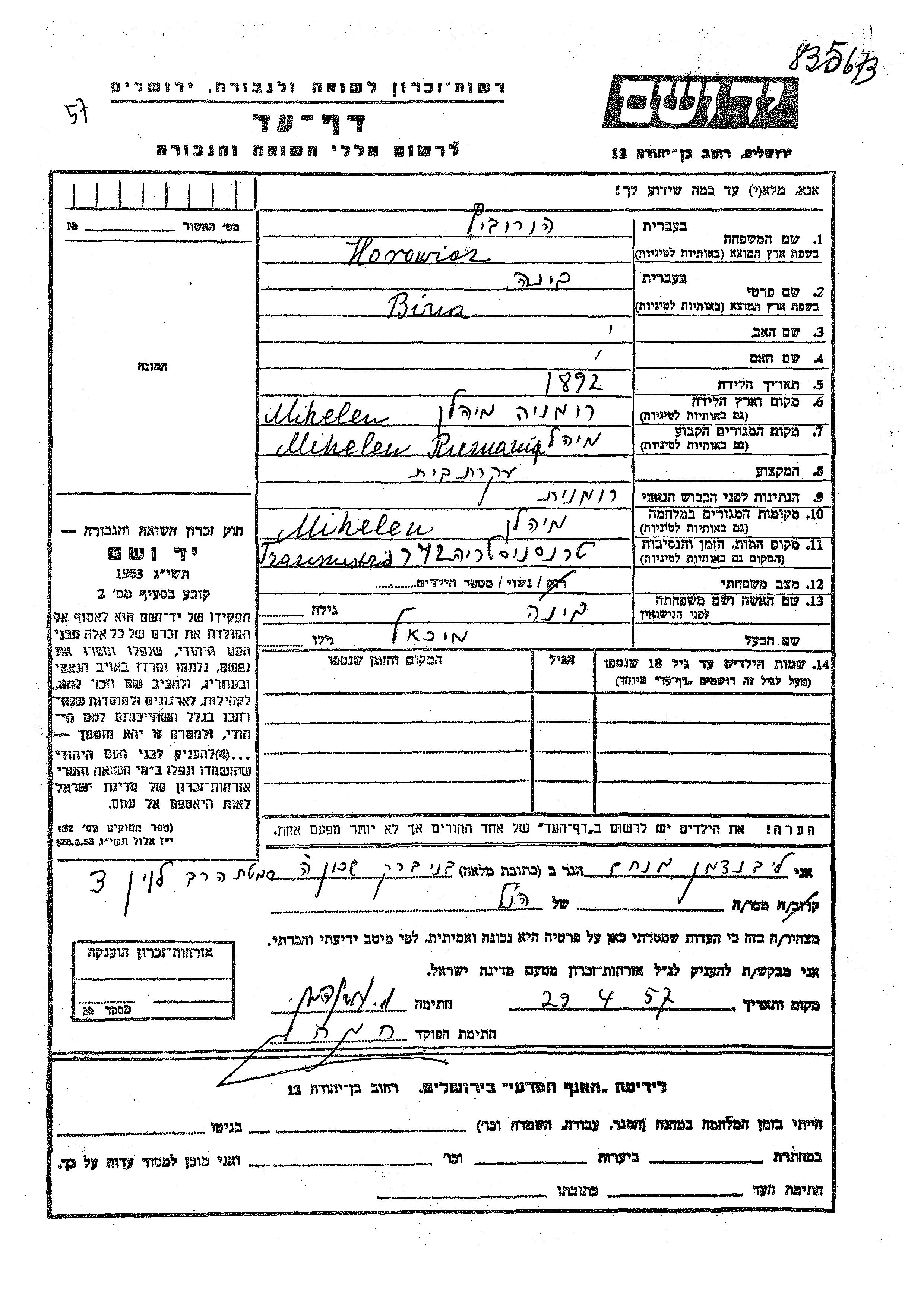 Horowicz Bina 1892 Mihaileni, Roumanie Feuille de témoignage
