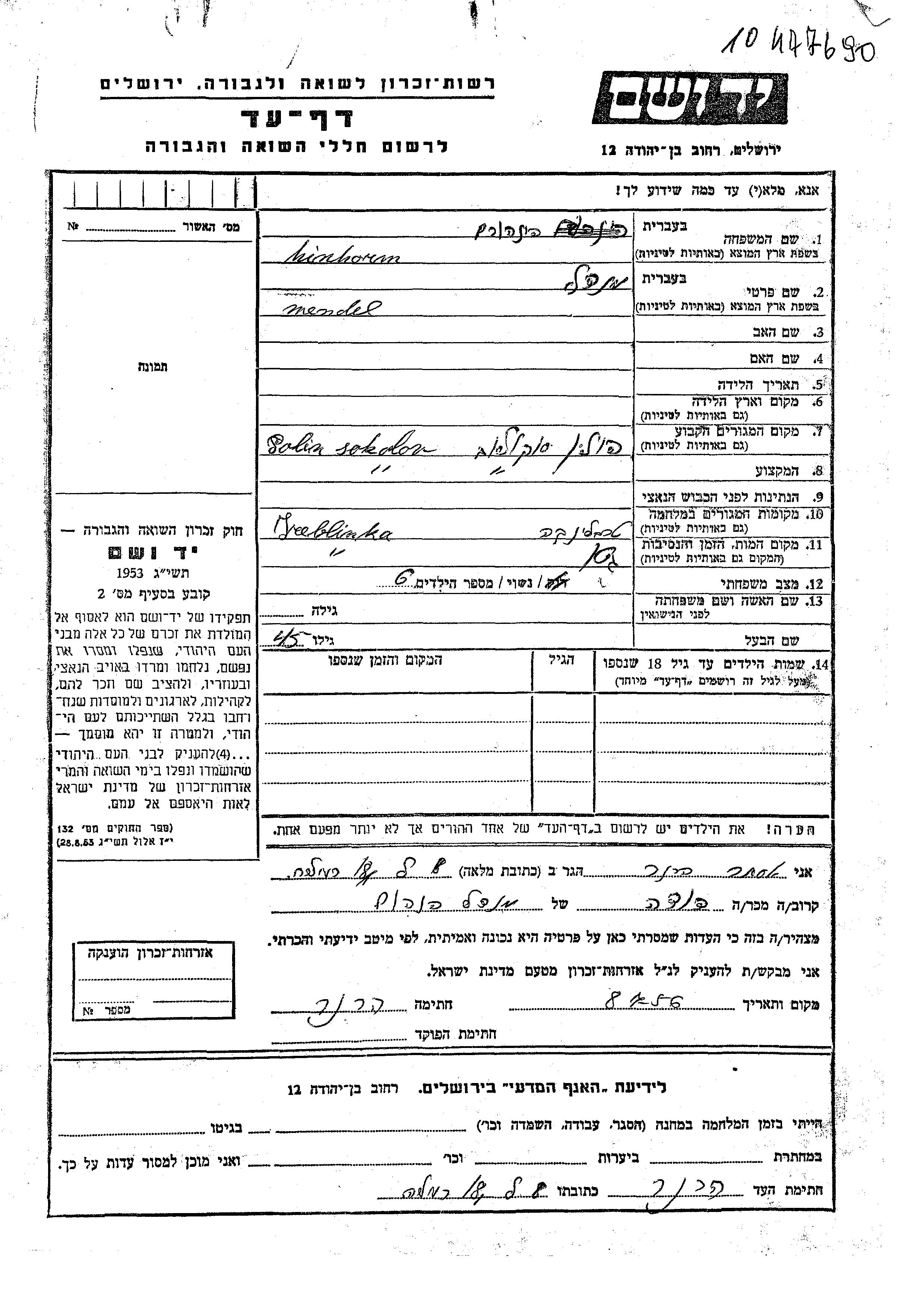 Mendel Hinhorm. Il était Marié. Avant la seconde guerre mondiale il vivait à Sokolow, Pologne. Au cours de la guerre, il était à Treblinka, Pologne.