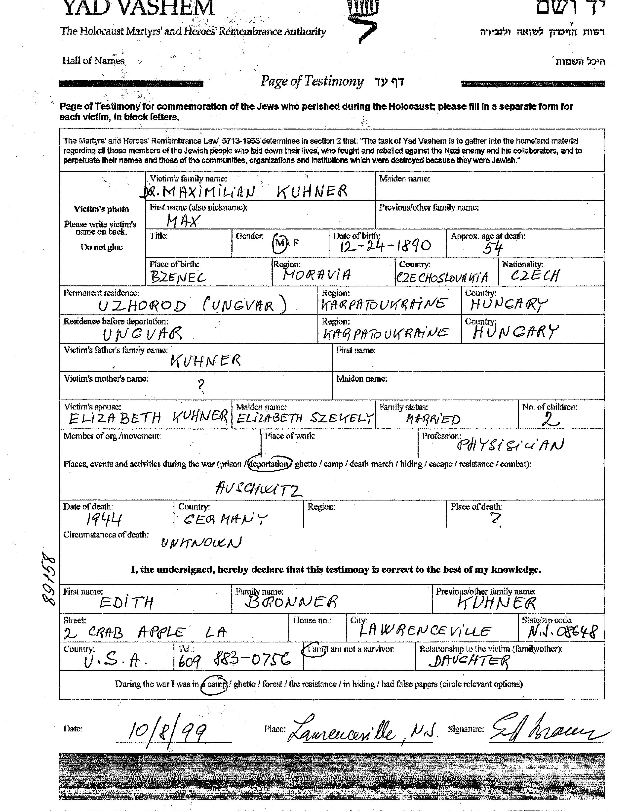 Kuhner | Maximilian | 1890 | Uzhorod, Tchécoslovaquie | Feuille de témoignage |