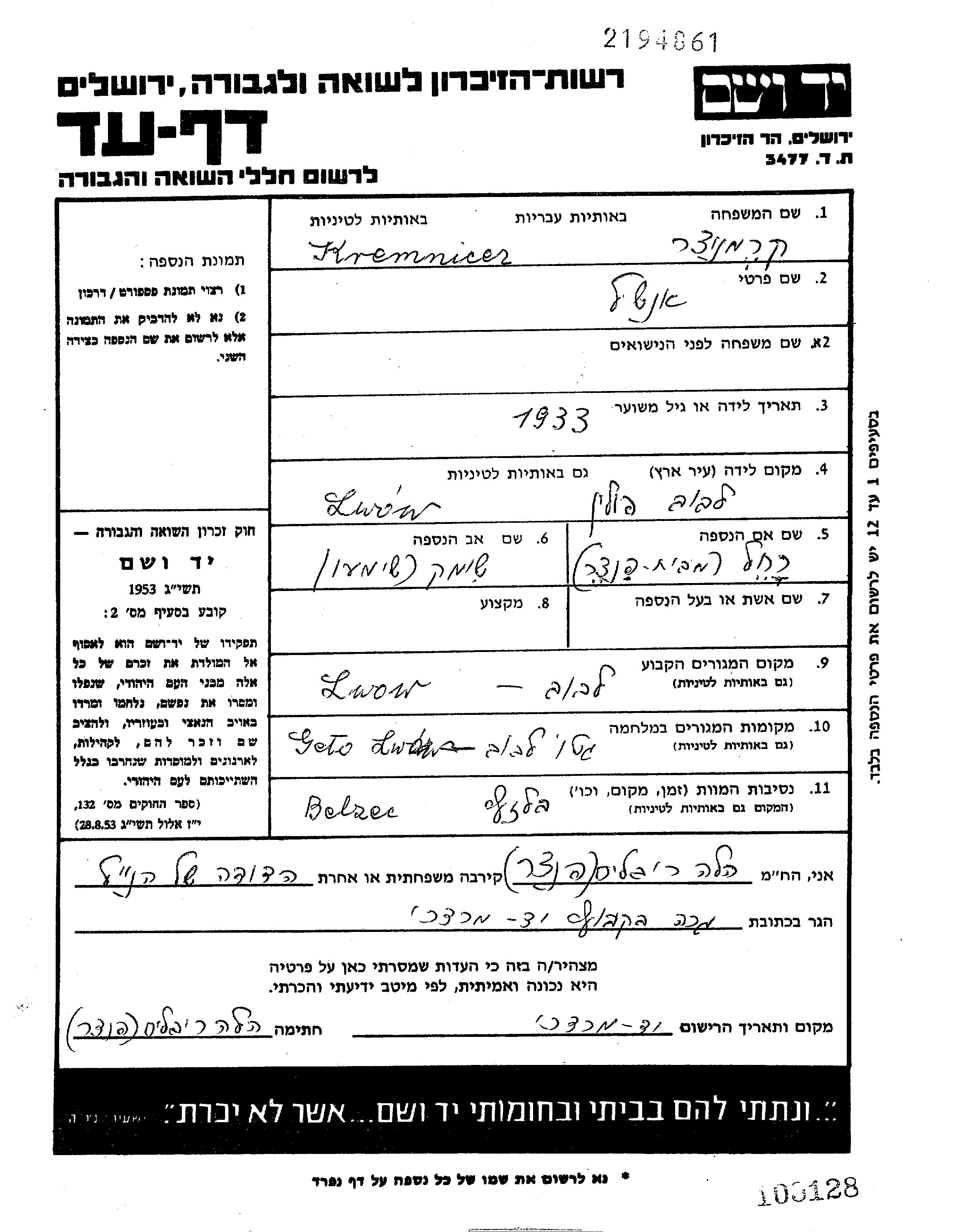 Kremnicer Anshel 1933 Lwow, Pologne Feuille de témoignage