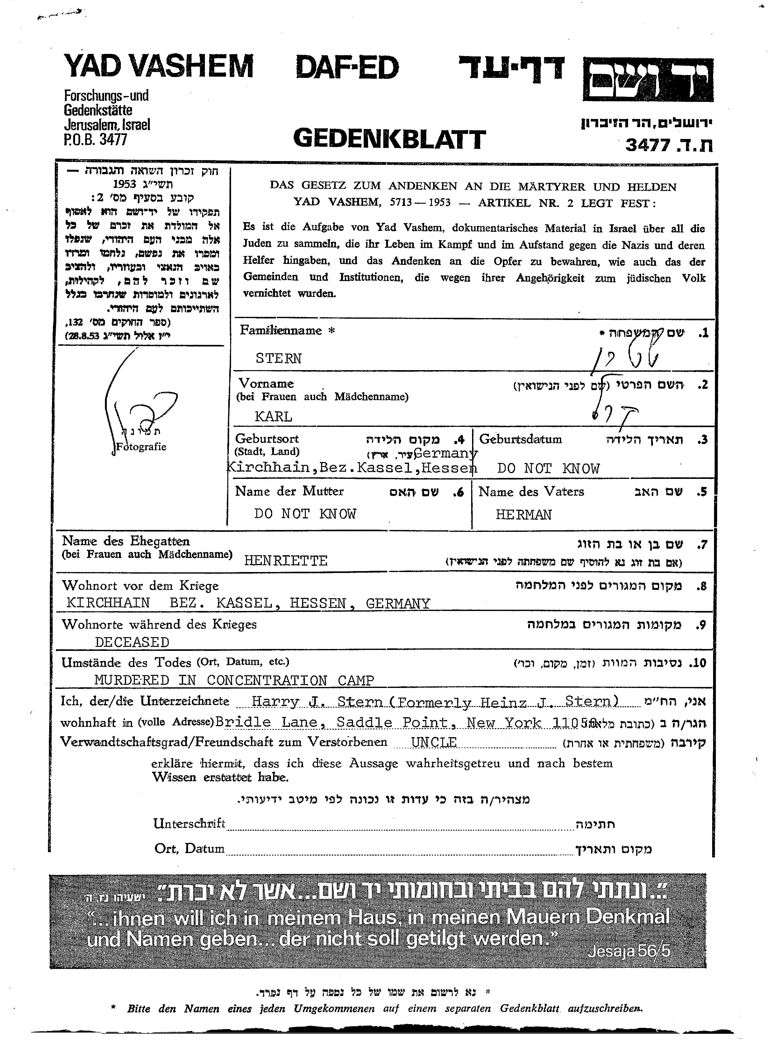 Stern Karl Kirchhain, Allemagne Feuille de témoignage