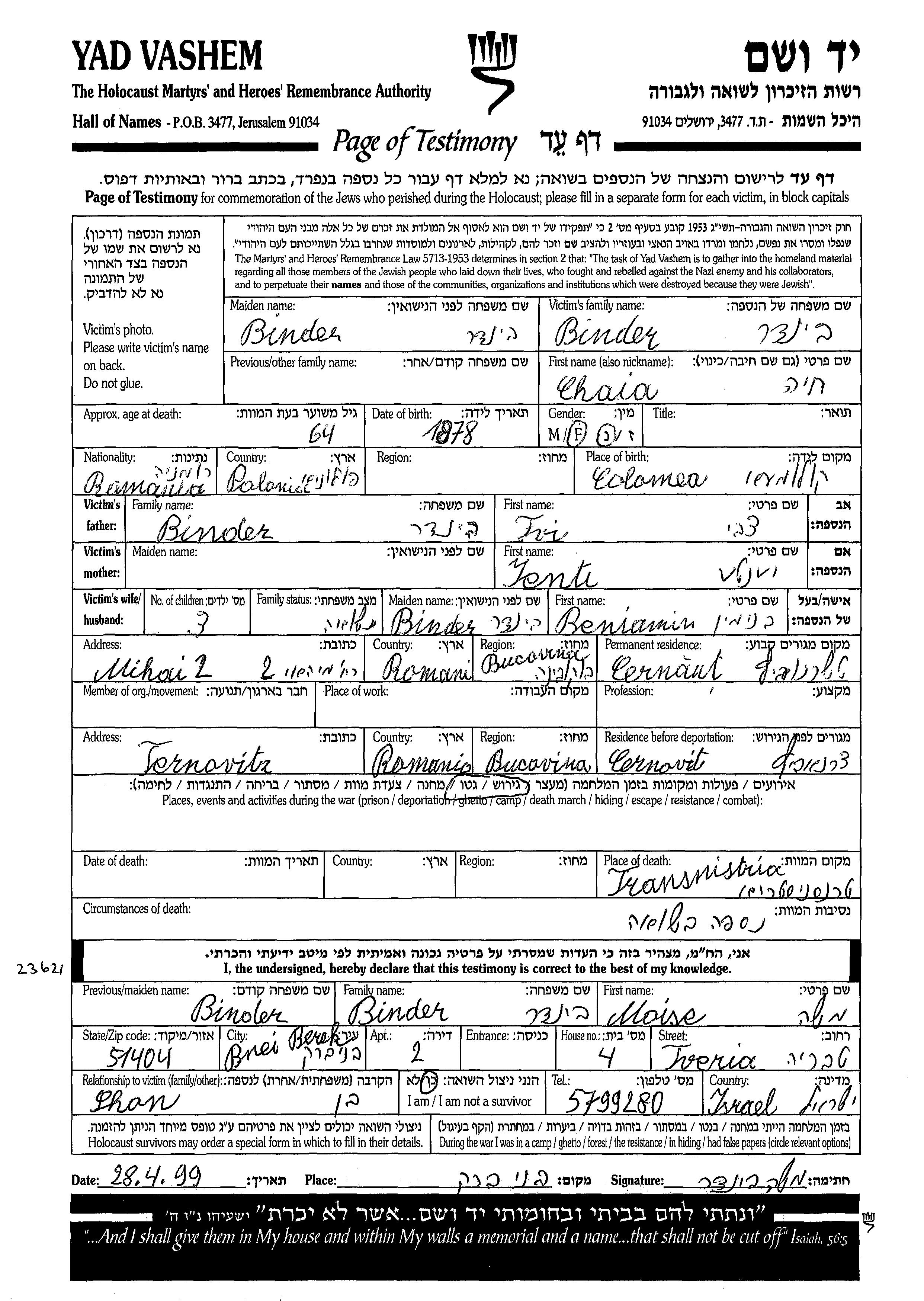 Chaia a été assassinée pendant la Shoah. Lieu de la mort: Transnistria, Ukraine (URSS).