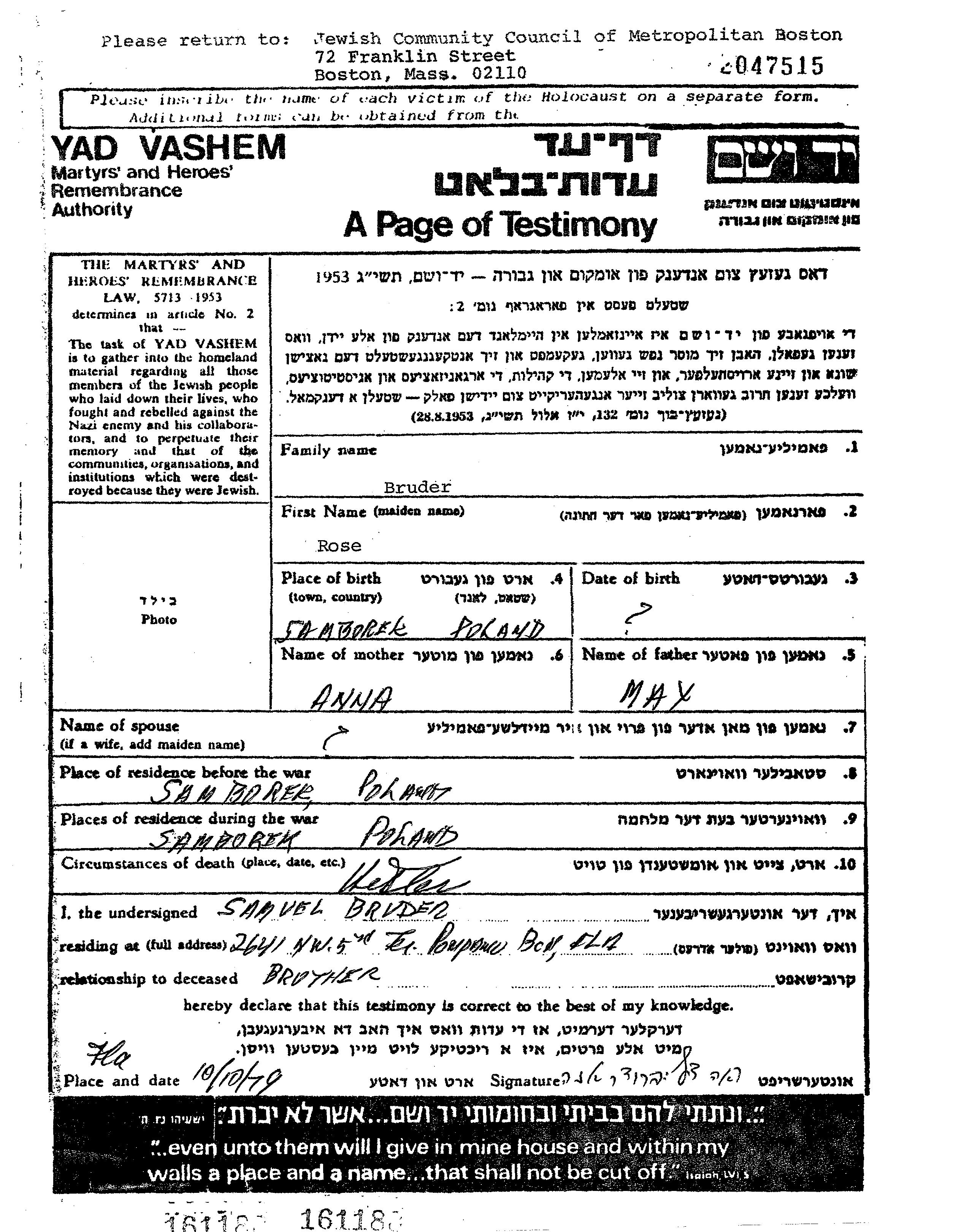 Rosa Bruder Broder est née à Samborek, Pologne. Avant la seconde guerre mondiale elle vivait à Samborek, Pologne.