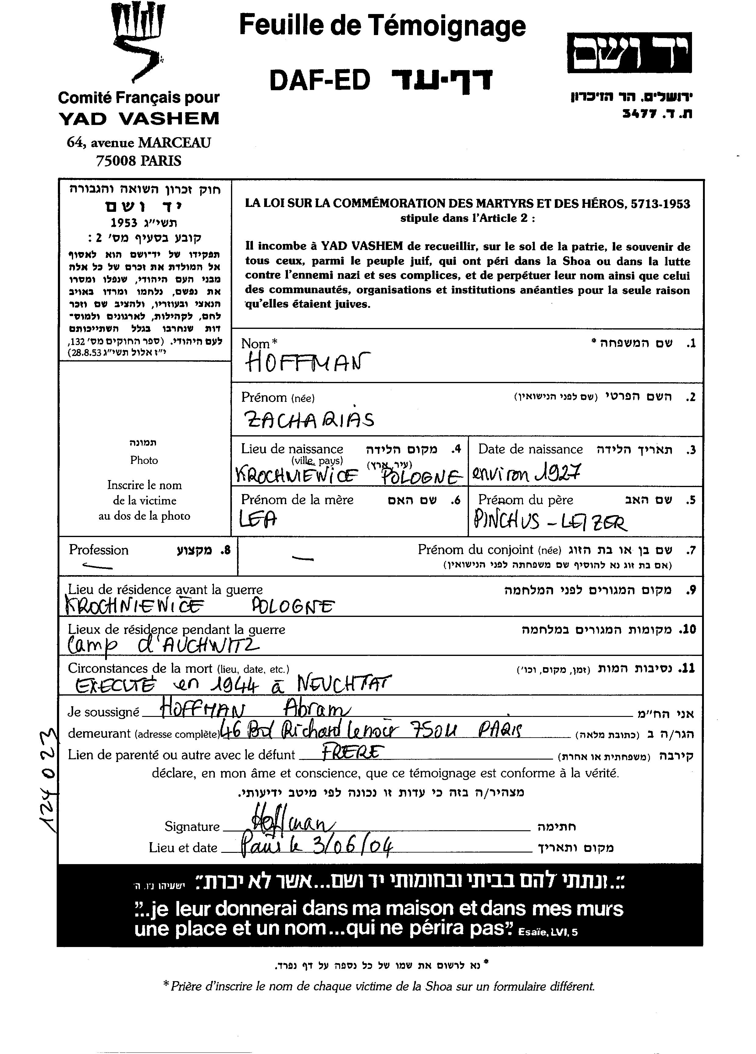 Hoffman Zacharias 1927 Kroschnowic, Pologne Feuille de témoignage