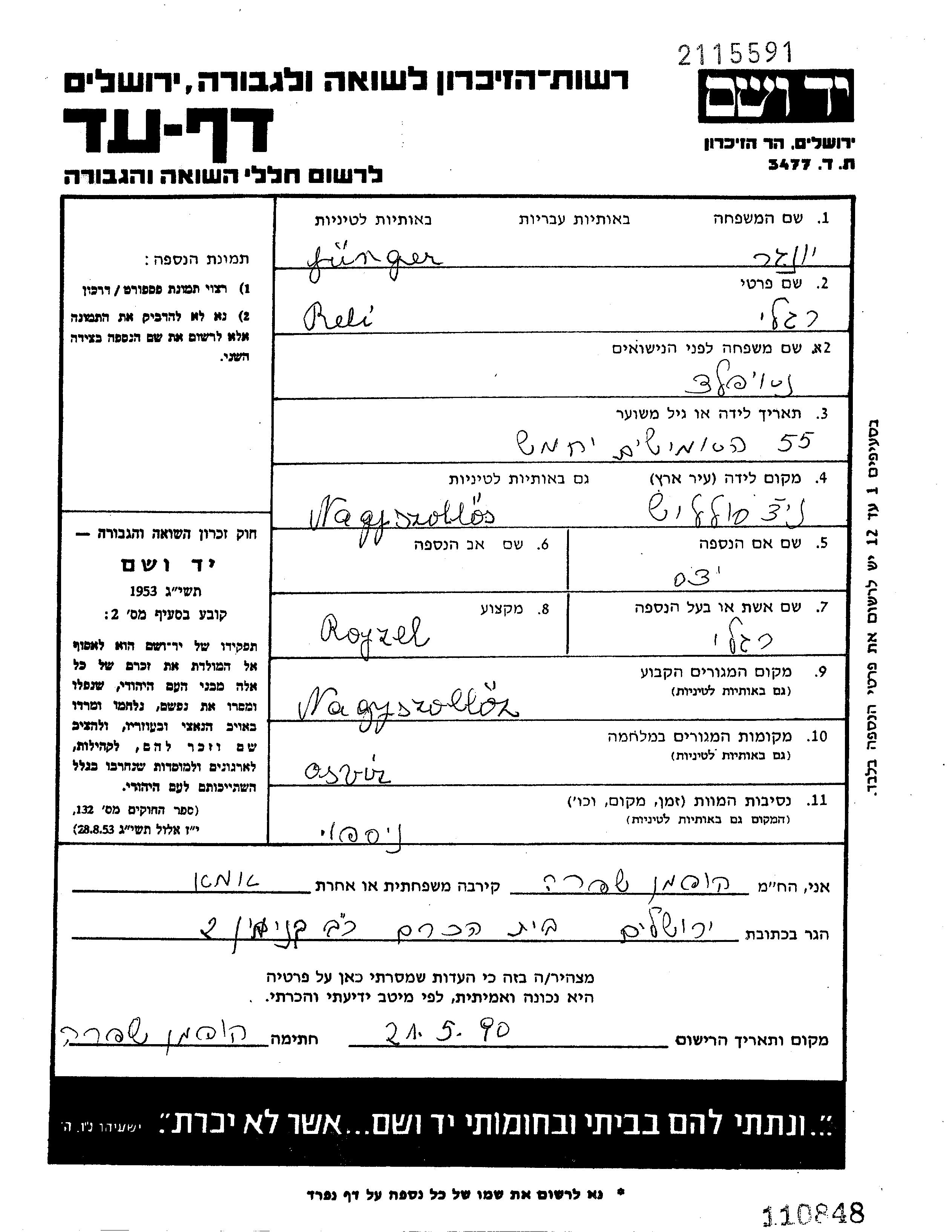 Rojzel Resli Reli Junger née Naifeld est née à Sevlus, Tchécoslovaquie en 1899. Elle était Femme au foyer. Avant la seconde guerre mondiale elle vivait à Sevlus, Tchécoslovaquie. Rojzel Resli Reli a été assassinée pendant la Shoah. Lieu de la mort: Auschwitz, Pologne en 1944.
