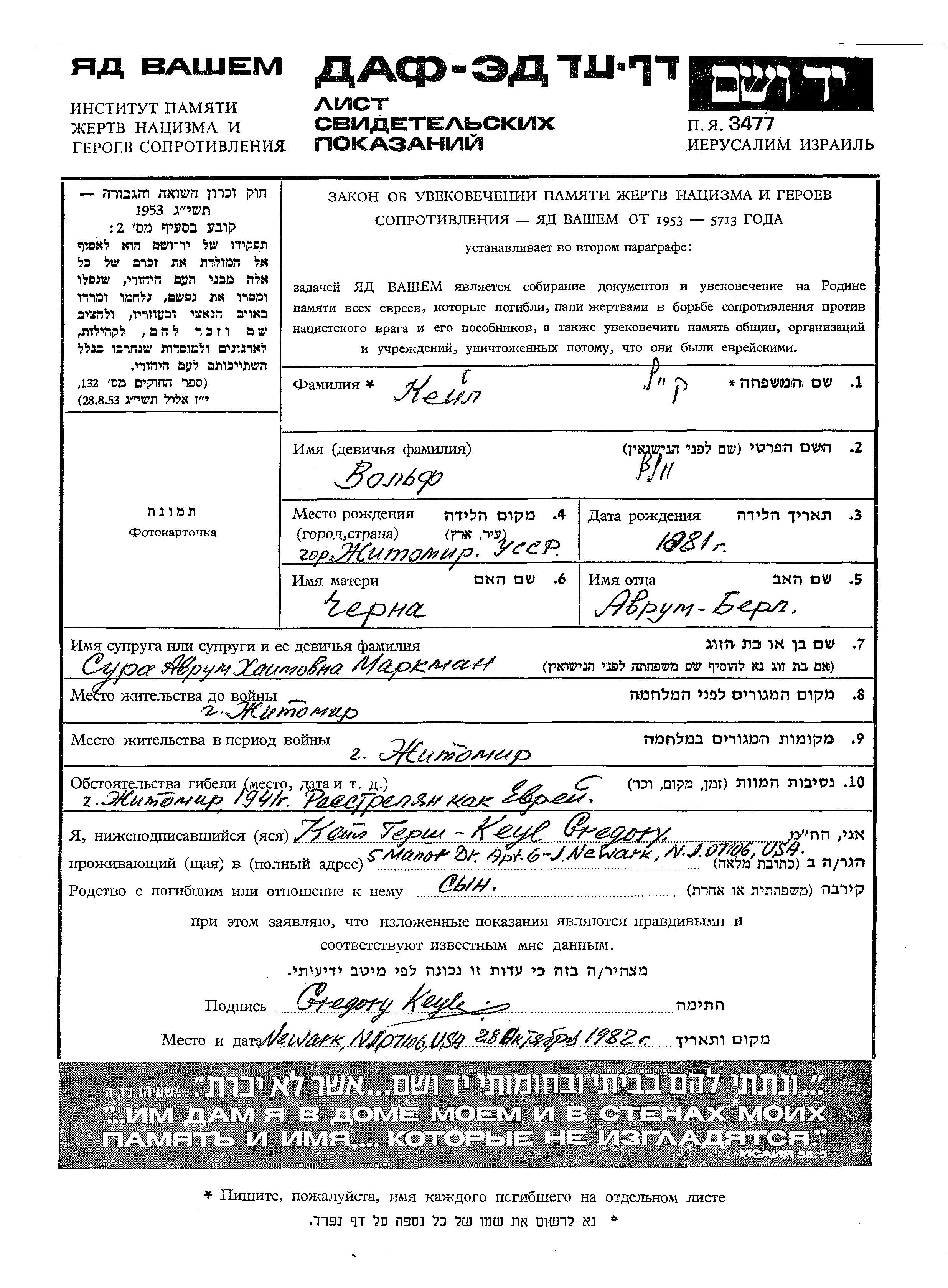 Volf Keil est né à Zhitomir, Ukraine (URSS) en 1881. Il était Tailleur. Avant la seconde guerre mondiale il vivait à Zhitomir, Ukraine (URSS).