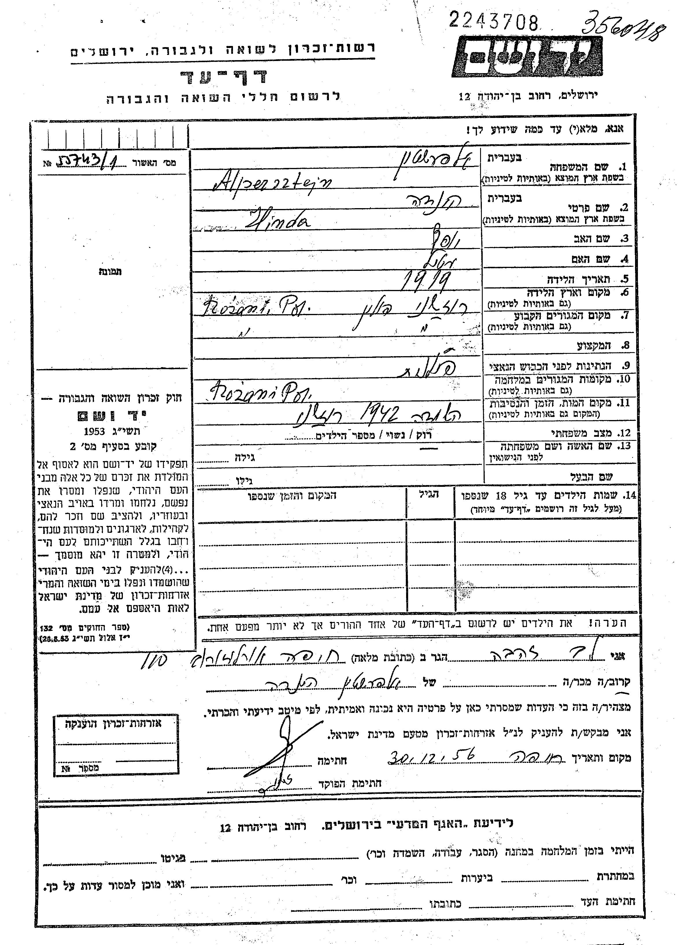 Alpershtein | Hinda | Rozana, Pologne | Liste des Juifs assassinés compilés dans les Livres de Souvenir (Yzkor books) |