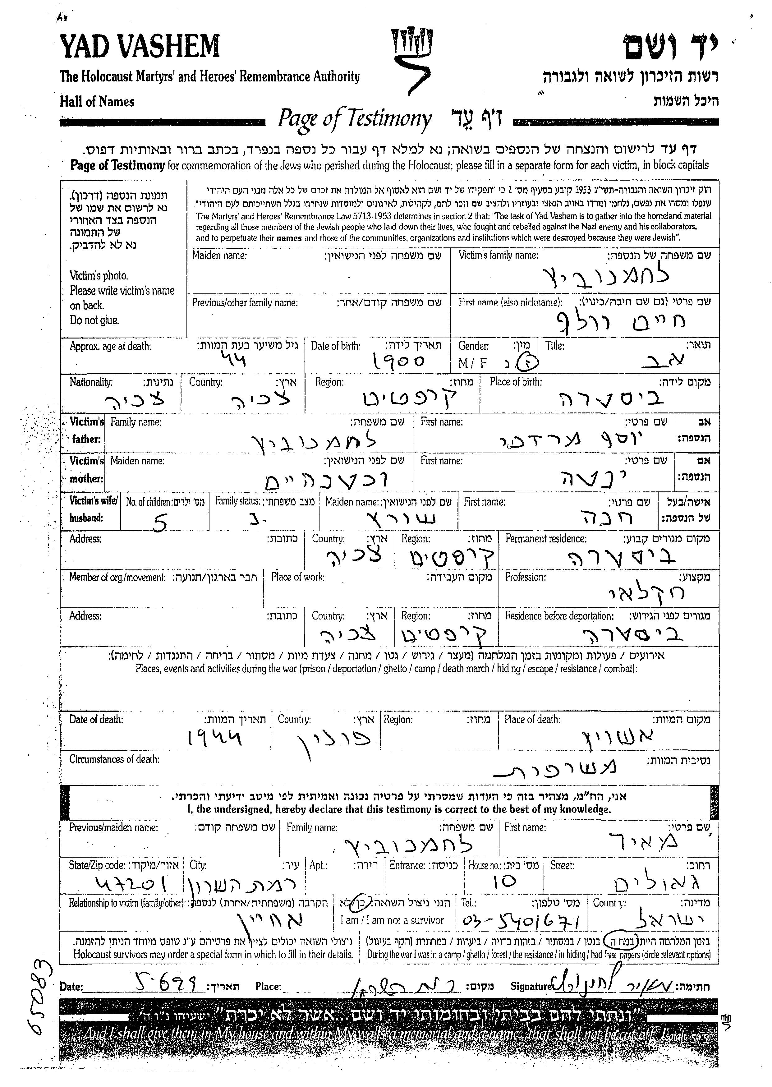 | Lakhmanovitz | Khaim Volf | 1900 | Bystra, Tchécoslovaquie | Feuille de témoignage |