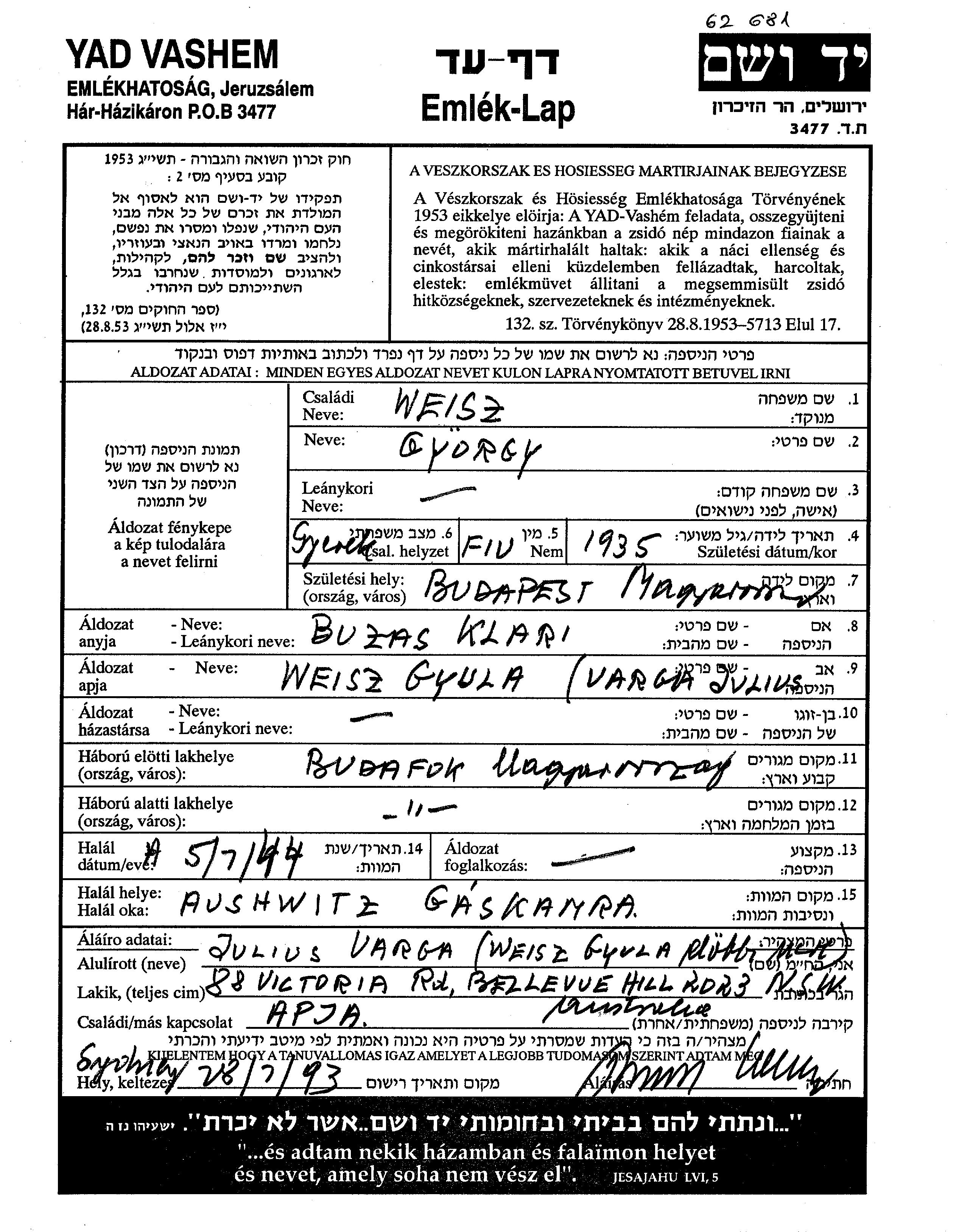 Weisz | Gyorgy | 1935 | Budafok, Hongrie | Feuille de témoignage |