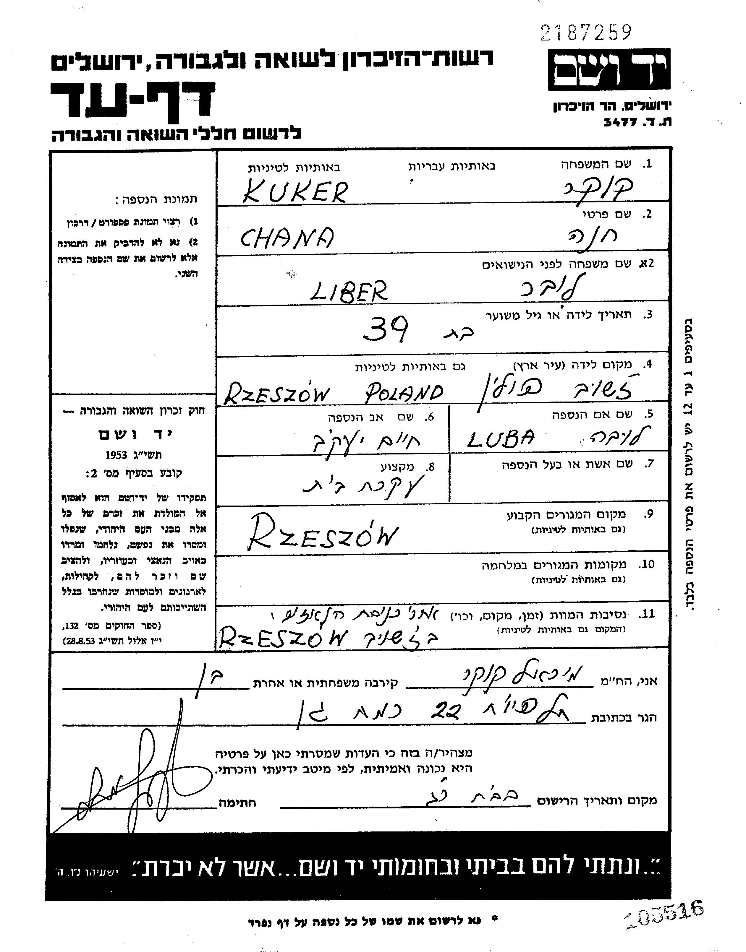 | Kuker | Chana | 1900 | Rzeszow, Pologne | Feuille de témoignage |