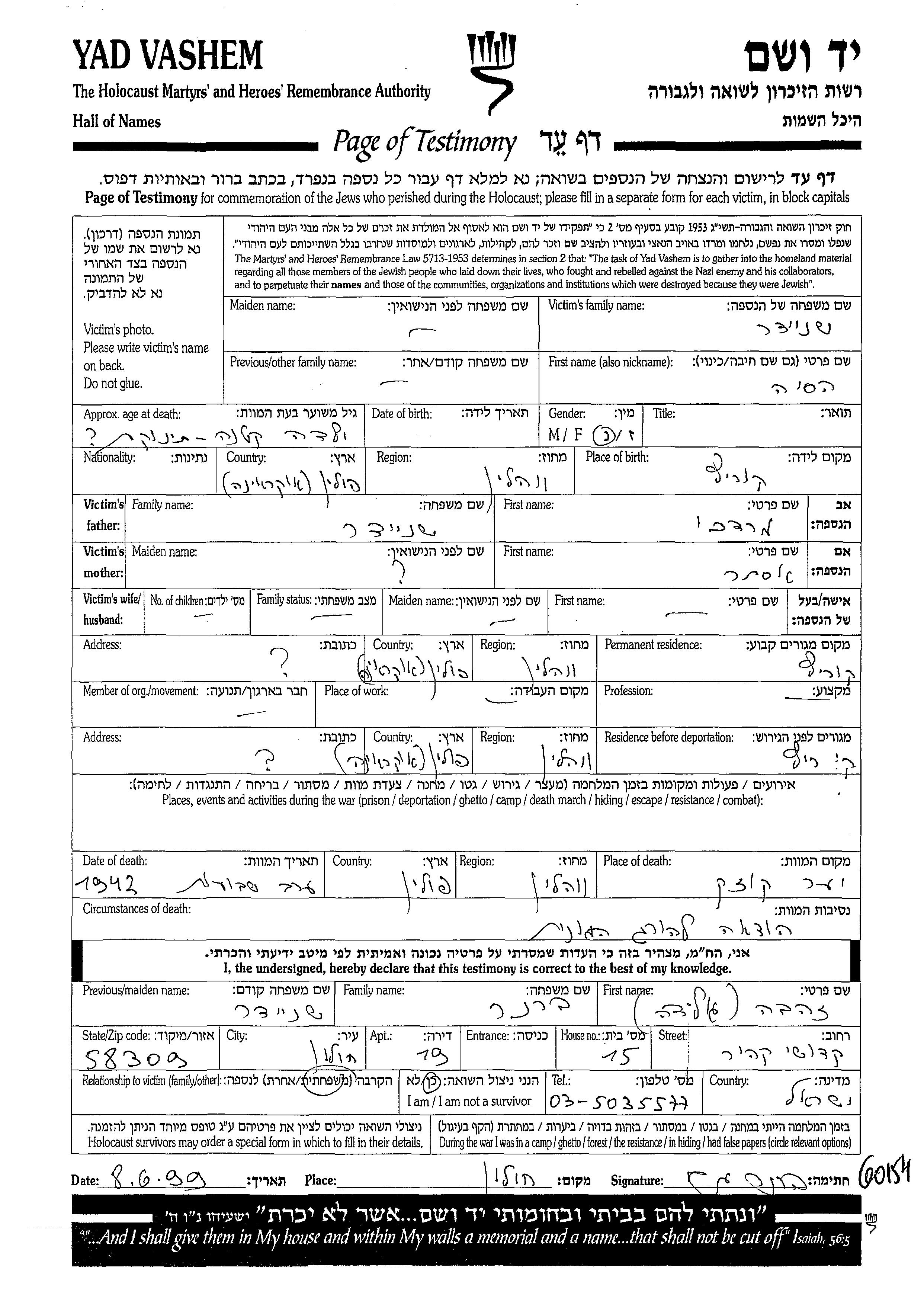 Yad Vashem - Pages of Testimony Names Memorial Collection