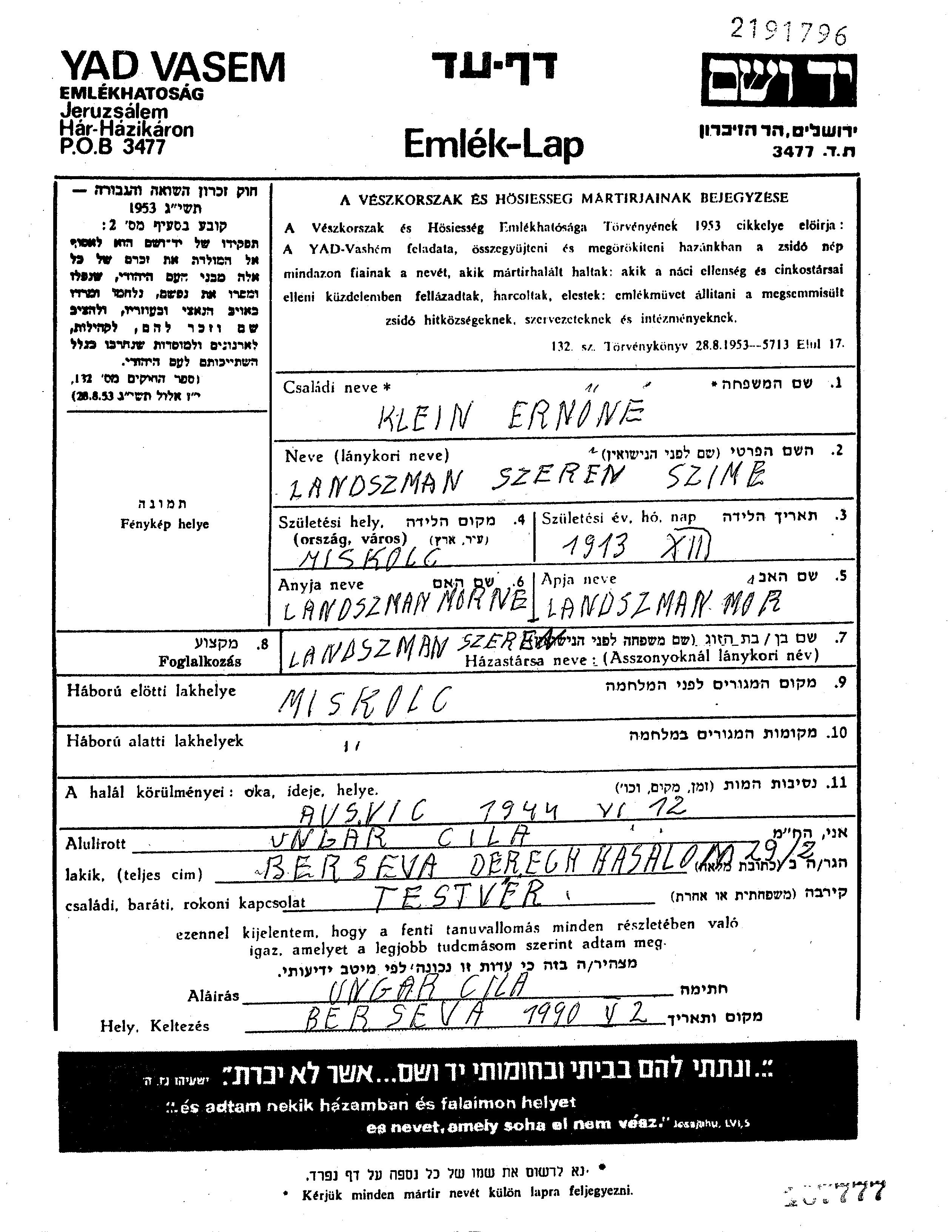 Klein Szeren Szime Sima 1913 Miskolc, Hongrie Feuille de témoignage