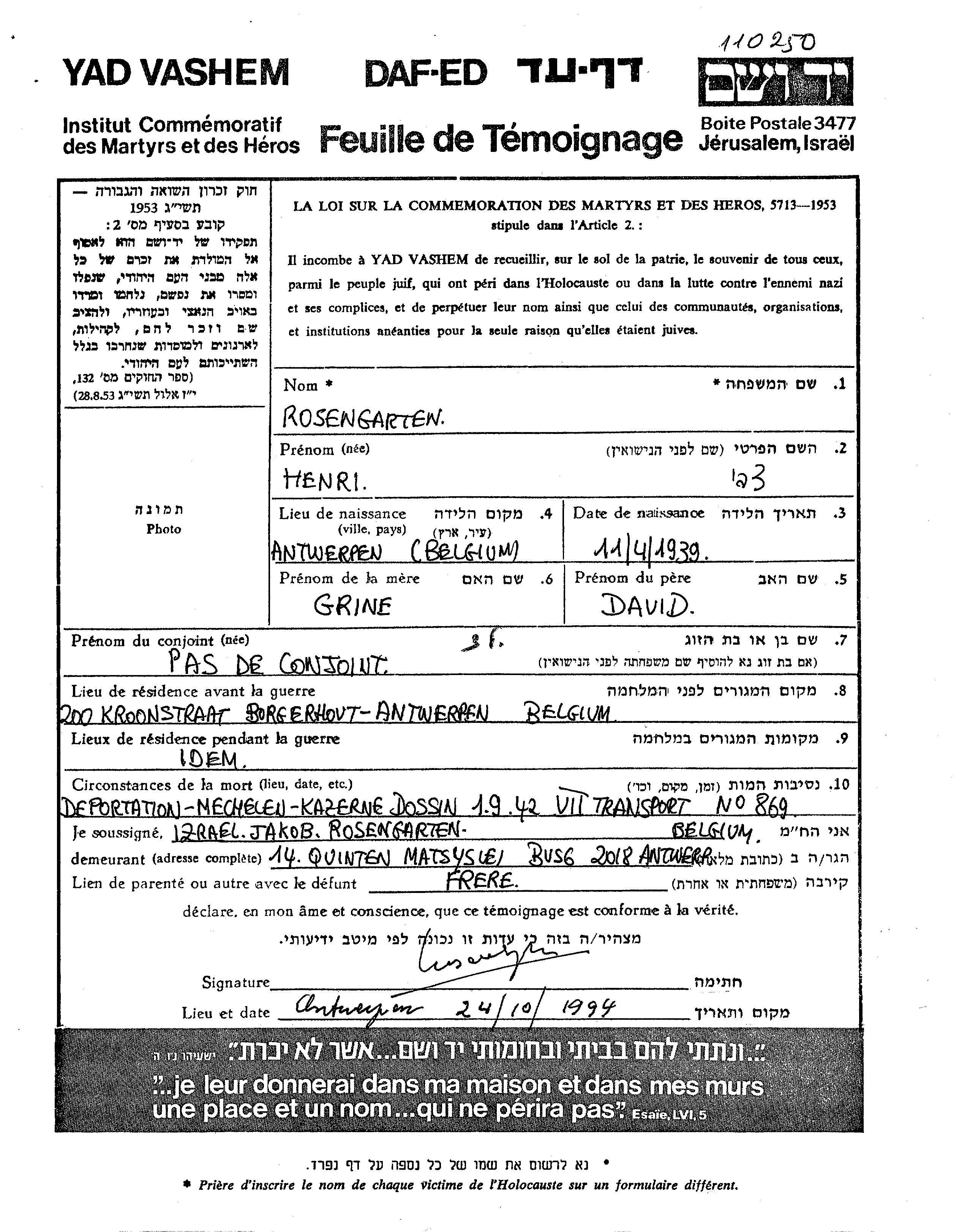 Rosengarten Henri Tzvi 1939 Borgerhout, Belgique Feuille de témoignage