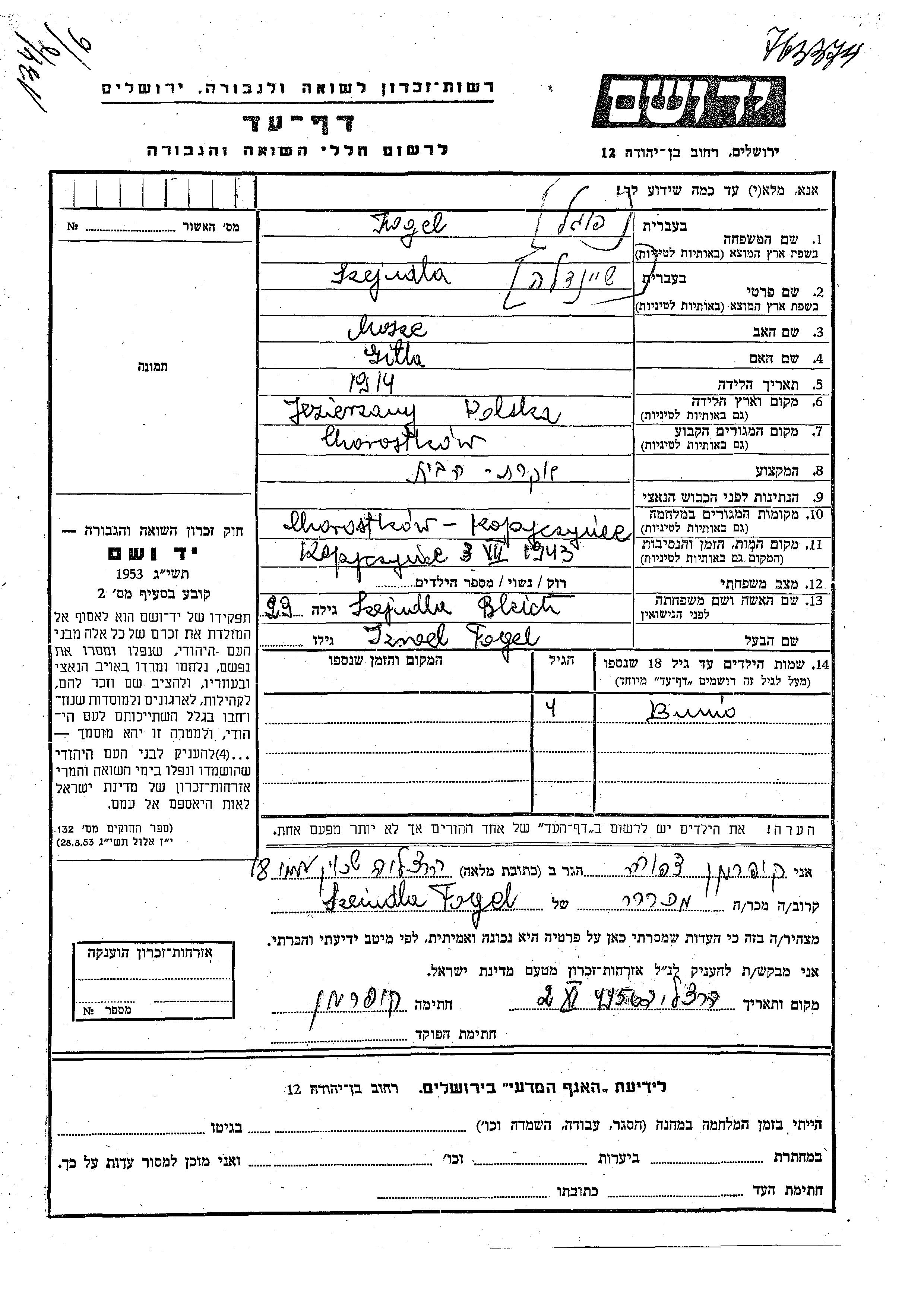 Fogel Szejndla 1914 endroit inconnu, Feuille de témoignage