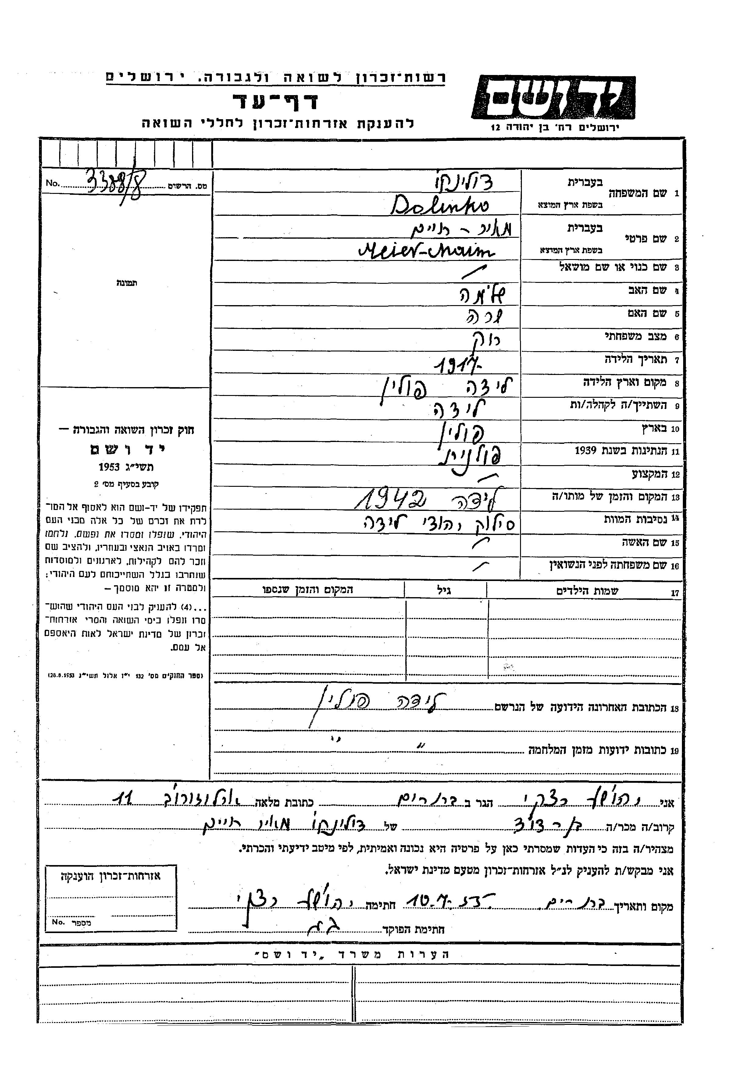 Dolinko Meir Chaim 1917 Lida, Pologne Feuille de témoignage