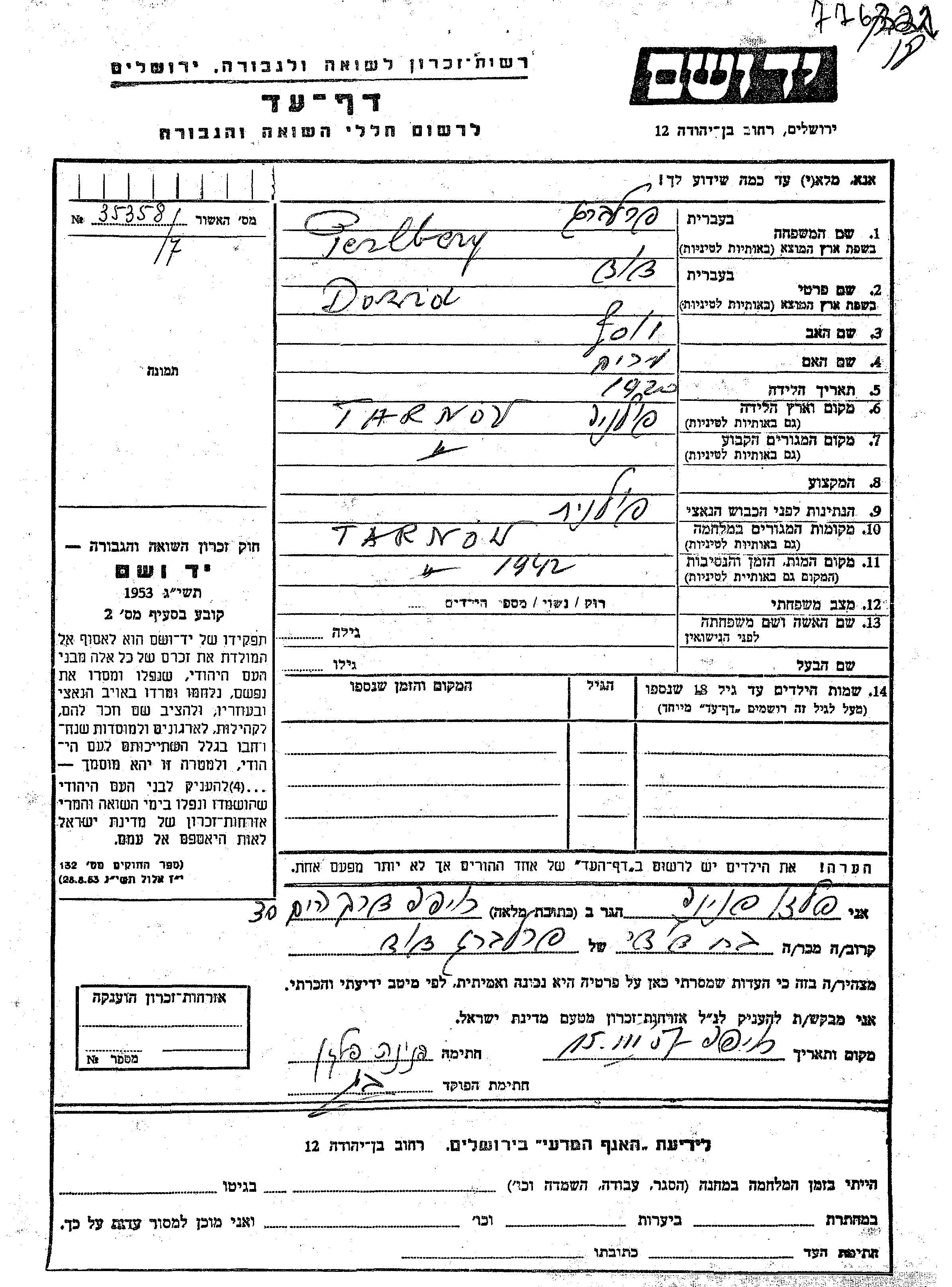 Dawid Perlberg est né à Tarnov, Pologne en 1920. Avant la seconde guerre mondiale il vivait à Tarnow, Pologne.