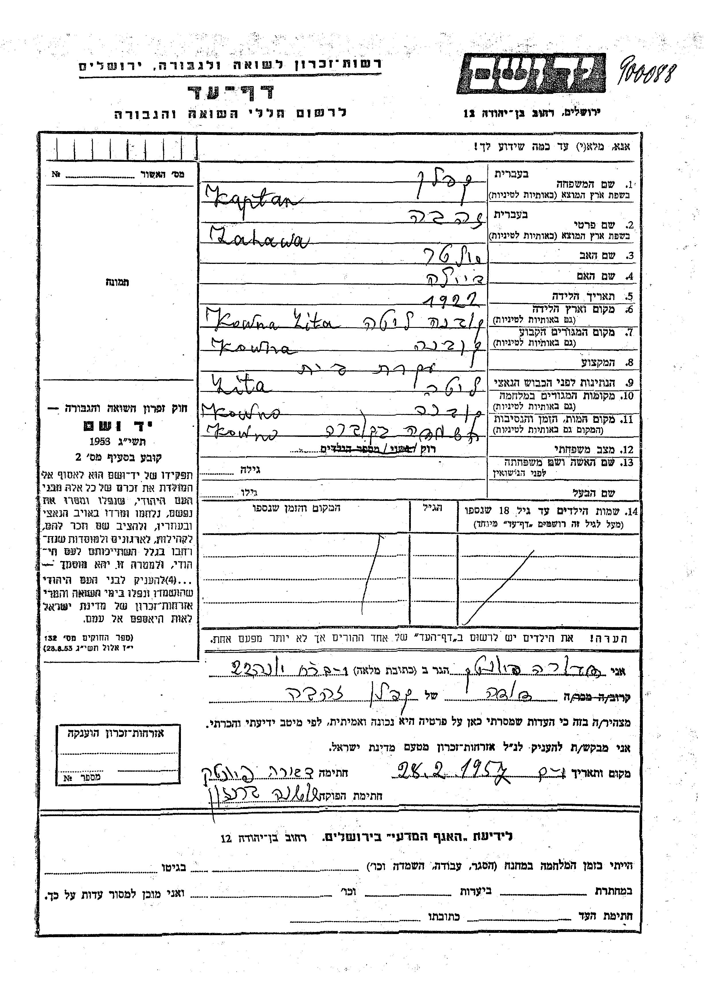 Zahawa Golda Kaplan est née à Kaunas, Lituanie en 1922. Avant la seconde guerre mondiale elle vivait à Kaunas, Lituanie.