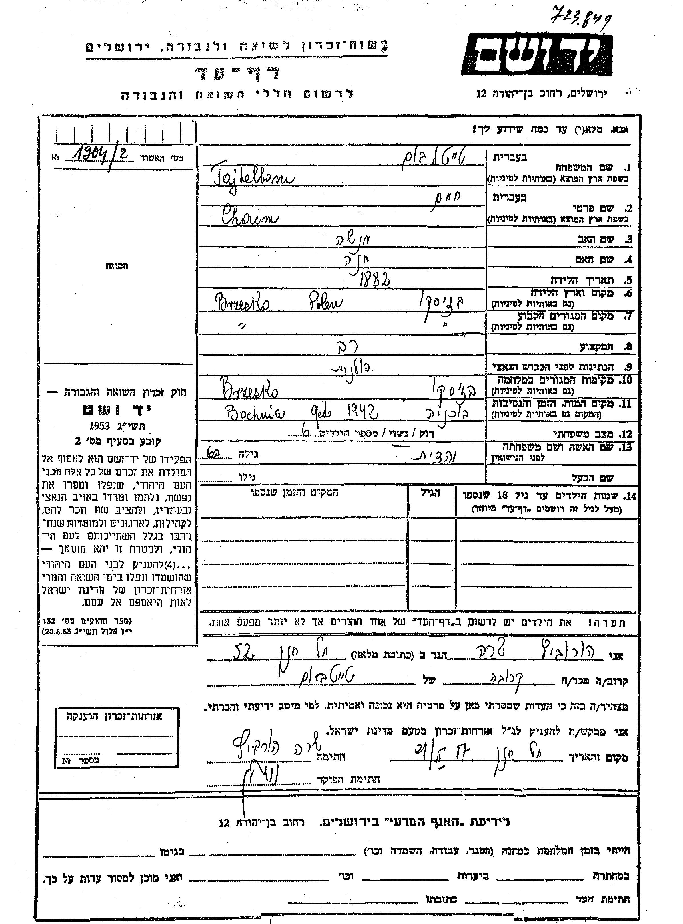 Tajtelbom Chaim 1882 Brzesko, Pologne Feuille de témoignage