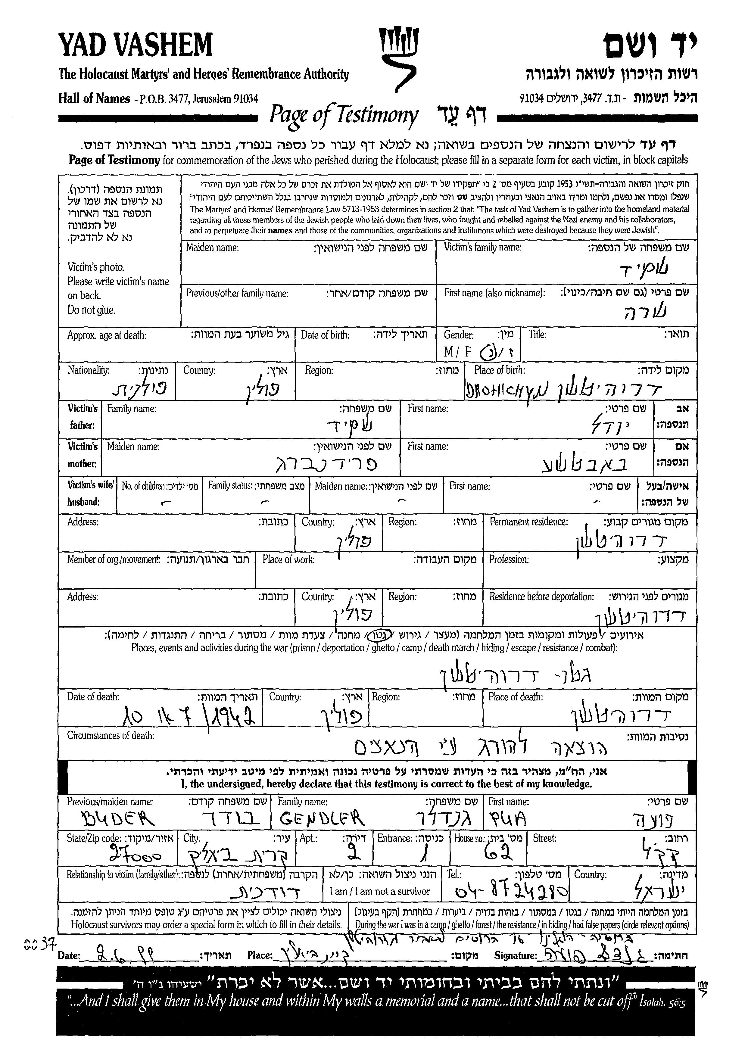 Yad Vashem - Pages of Testimony Names Memorial Collection